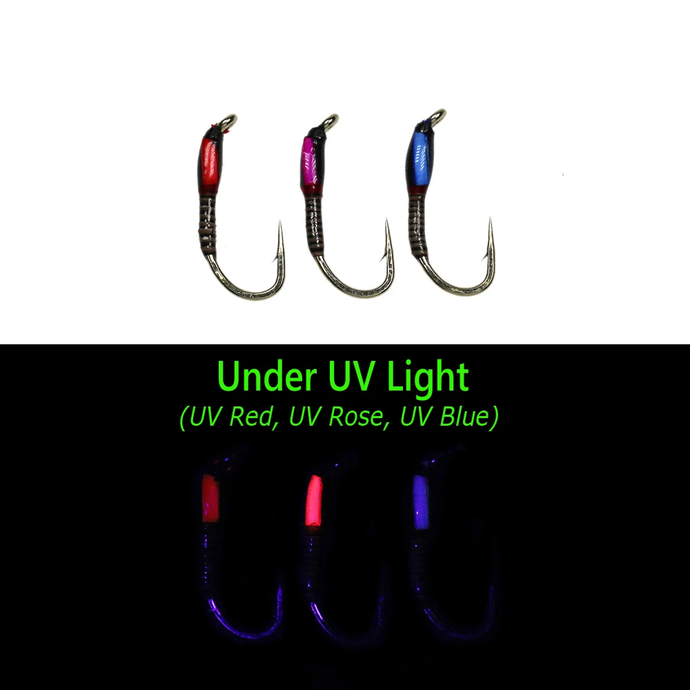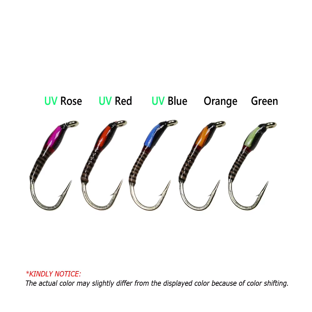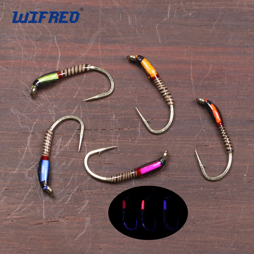 Wifreo 6 uds UV brillo epoxi Midge Buzzer ninfa mosca fluorescente pavo real Pluma ninfa trucha percha Grayling Señuelos de pesca cebo#10~#16