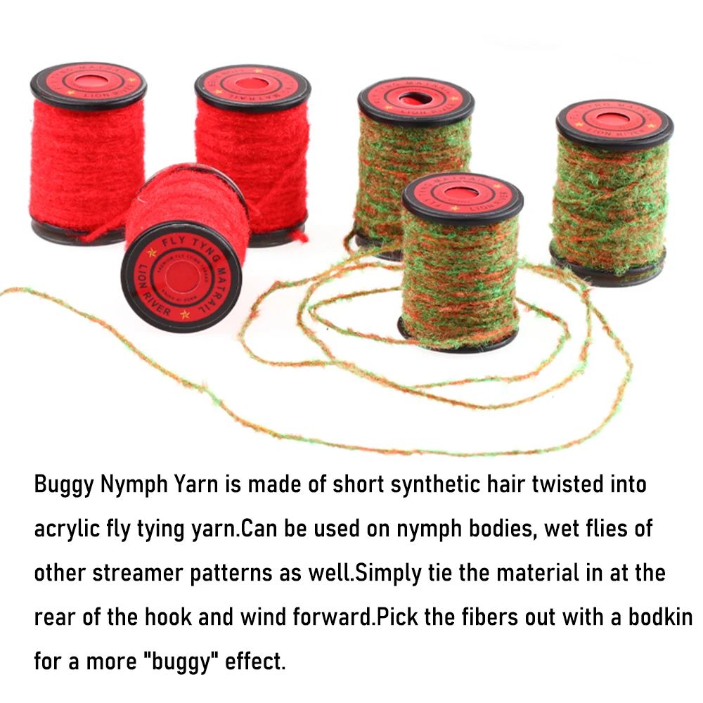 Buggy Nymph Yarn está hecho de pelo sintético corto, hilo para atar moscas enriquecido.También se puede utilizar en cuerpos de ninfas, moscas húmedas de otros patrones de serpentinas.Simplemente ate el material al lado del gancho y déle cuerda hacia adelante.Selecciona las fibras con un cuerpo para obtener un efecto más "buggy".