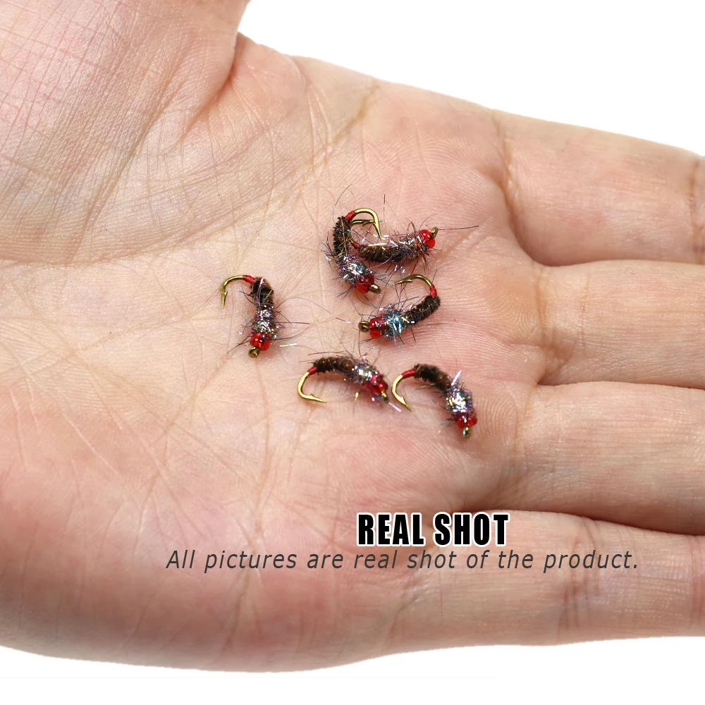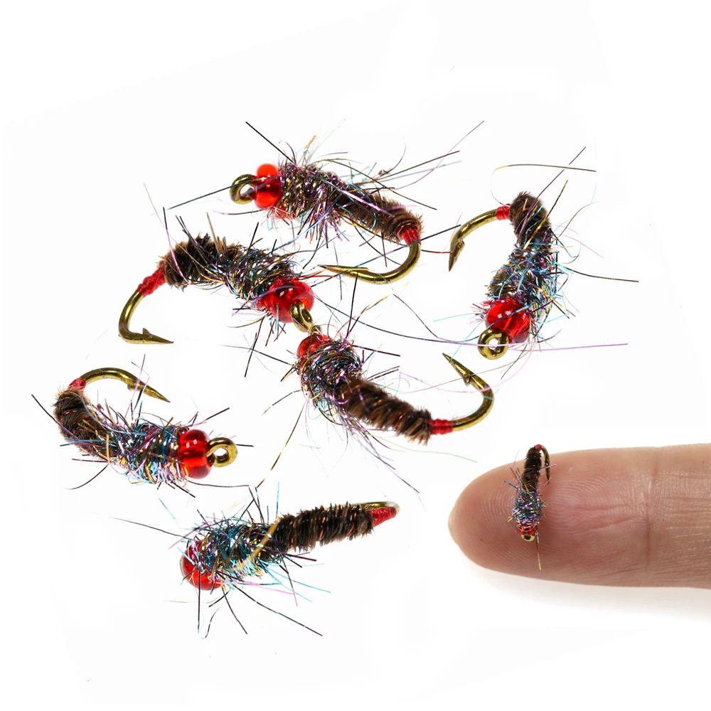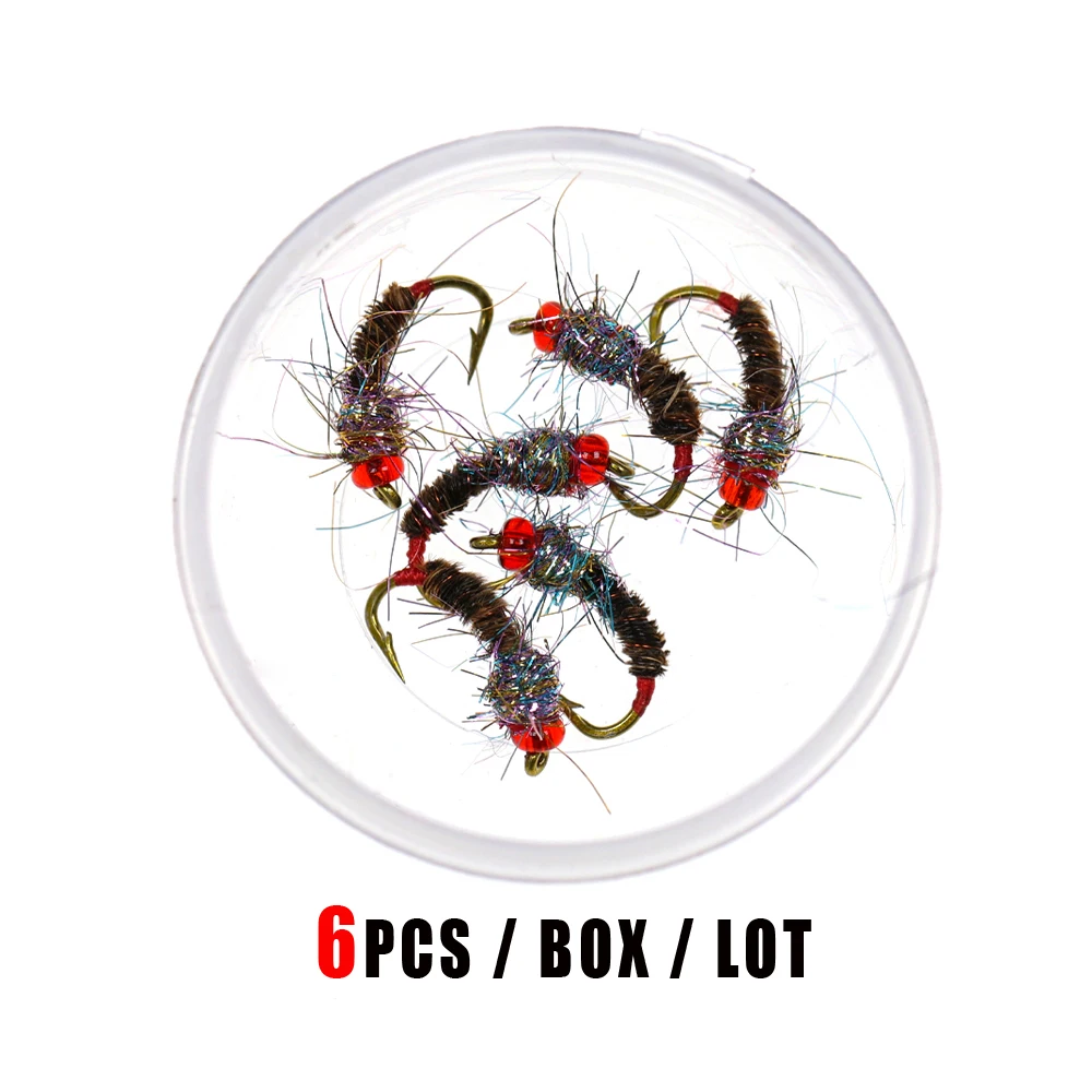 Wifreo 6PCS#14 plástico rojo cabeza de cuentas medio ninfa pavo real herl Hackle mosca atado gancho arco iris trucha lubina pesca moscas señuelos cebo