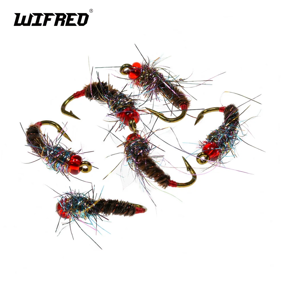 Wifreo 6PCS#14 plástico rojo cabeza de cuentas medio ninfa pavo real herl Hackle mosca atado gancho arco iris trucha lubina pesca moscas señuelos cebo