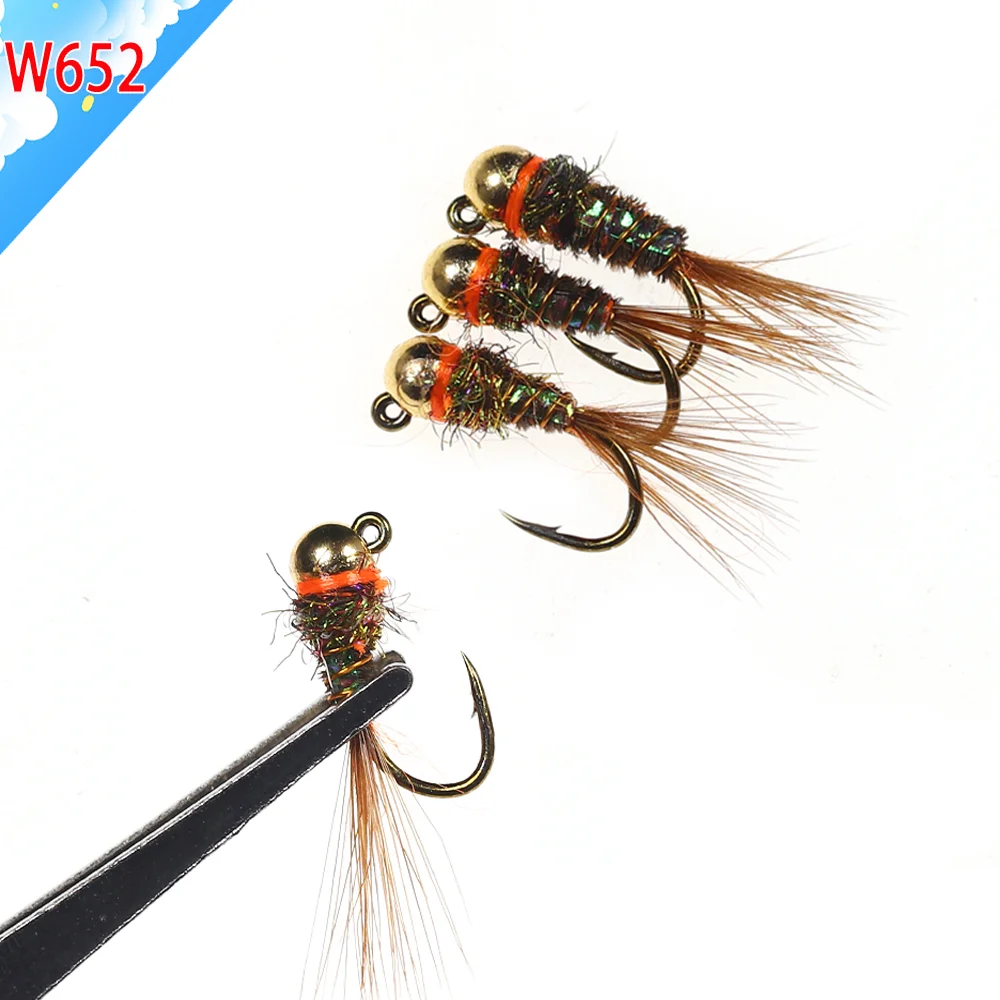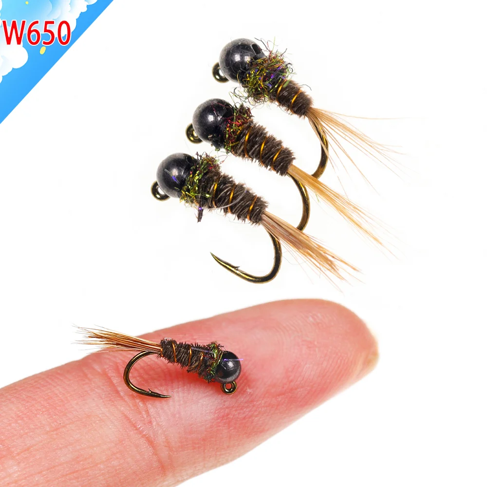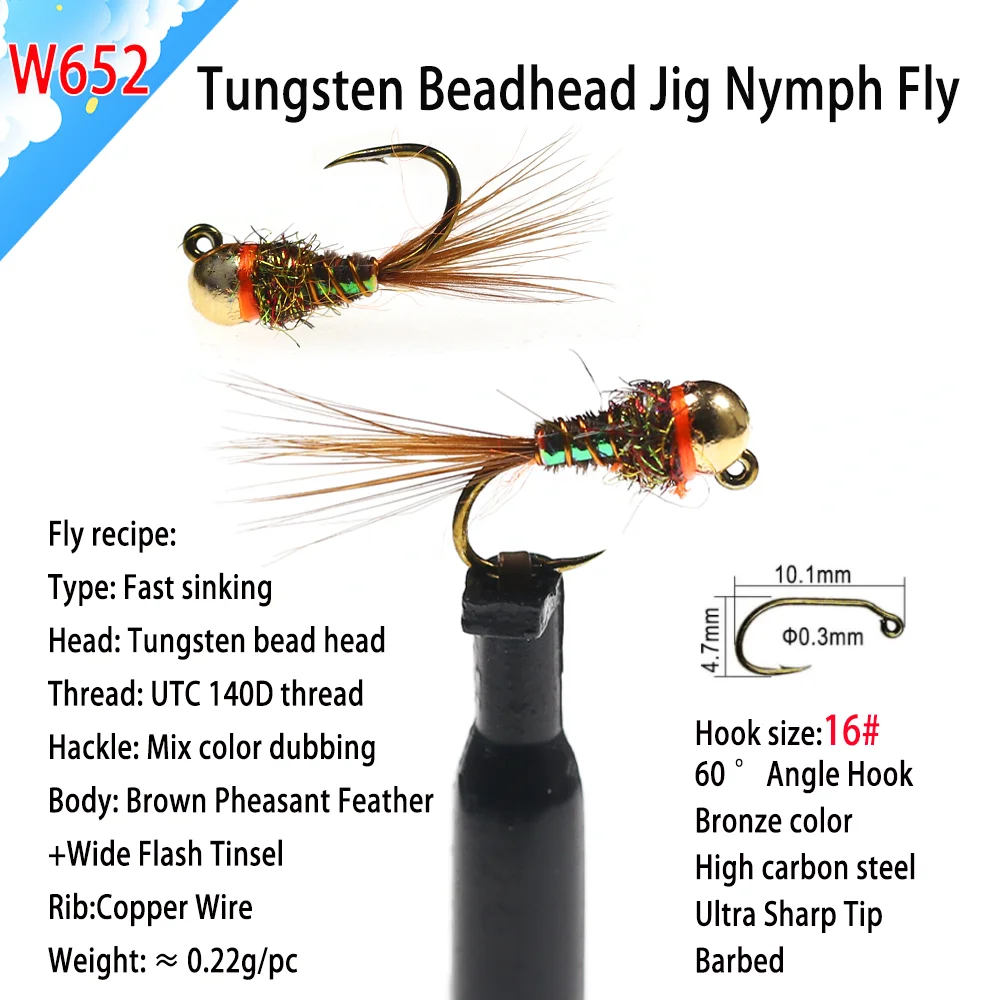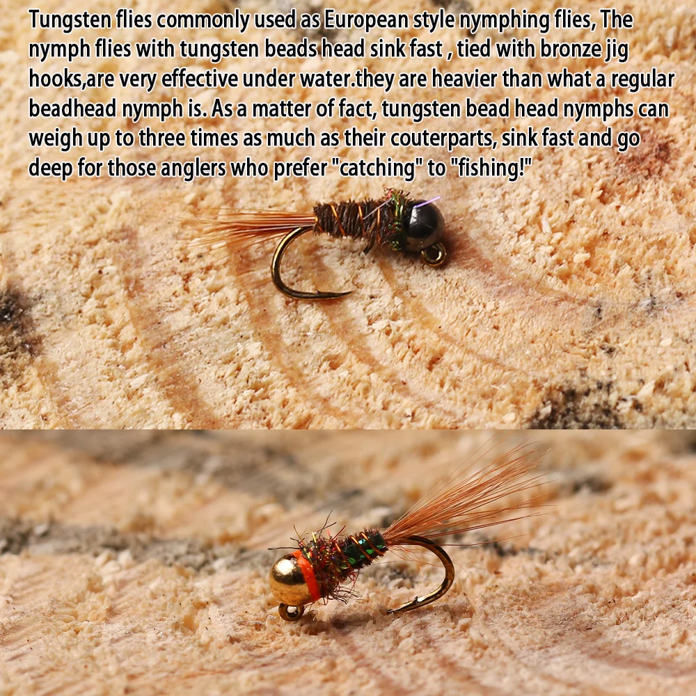 Moscas de tungsteno comúnmente usadas como moscas ninfas de estilo europeo, las moscas Ninfa con cabeza de cuentas de tungsteno se hunden rápidamente, atadas con ganchos de bronce, son muy efectivas bajo el agua. son más pesados de lo que es una ninfa beadhead normal. De hecho, las ninfas con cabeza de cuentas de tungsteno pueden pesar hasta tres veces más que sus contrapartes, hundirse rápidamente y profundizar para aquellos pescadores que prefieren "atrapar" a "pescar".