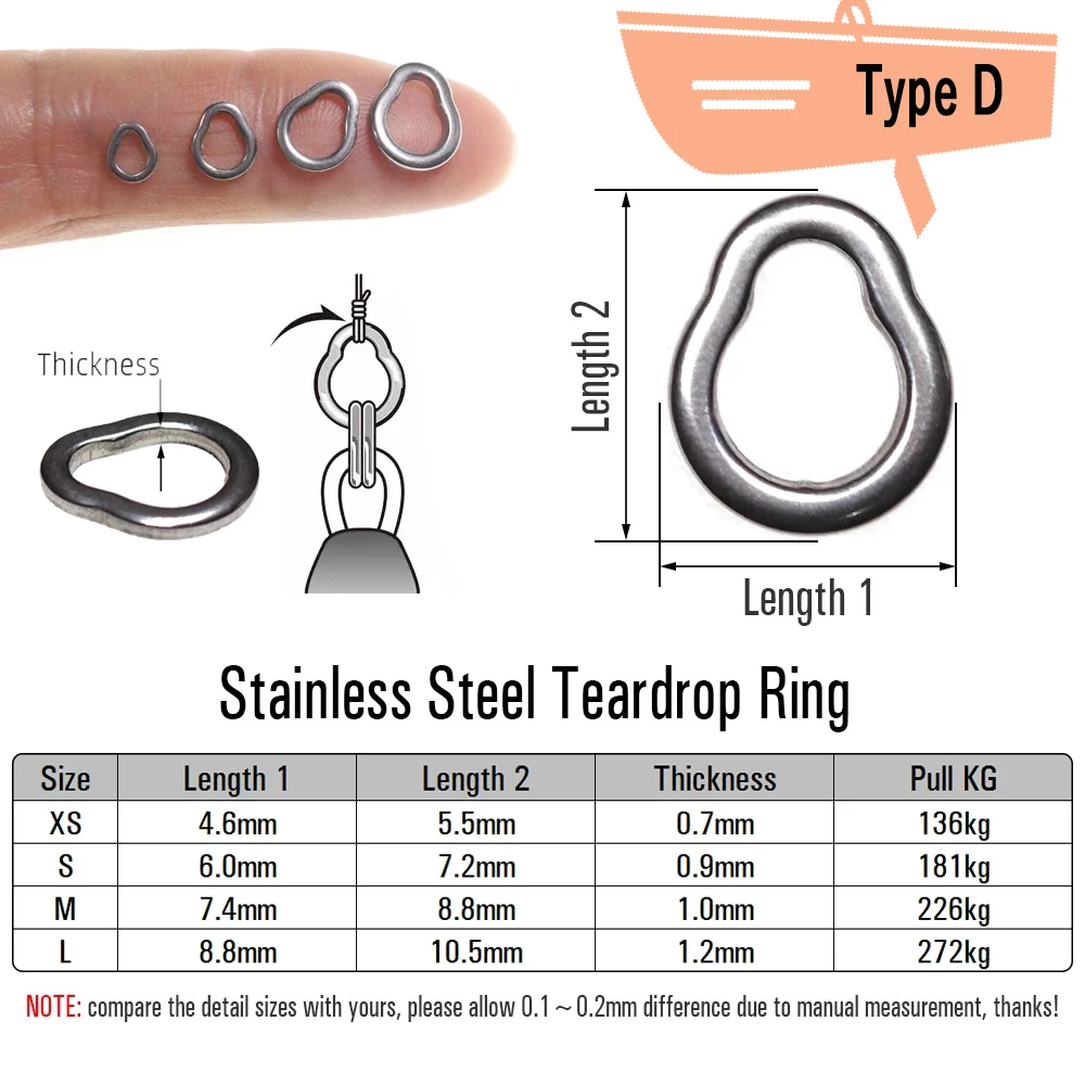 Tipo D: Anillos macizos en forma de pera de acero inoxidable para señuelos de pesca
