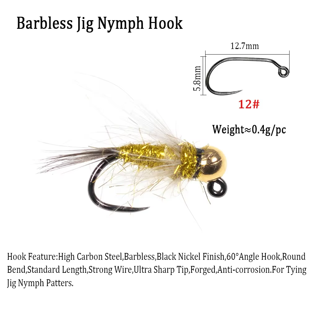 Características del gancho: sin púas, acabado en níquel negro, gancho de ángulo de 60 °, curva redonda, longitud estándar, alambre fuerte, Punta ultra afilada, forjado, plantilla de atado de ninfas con patrones de ninfa.