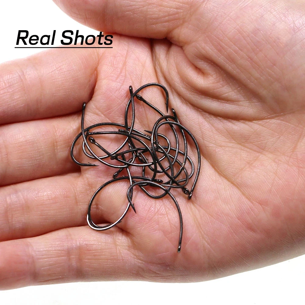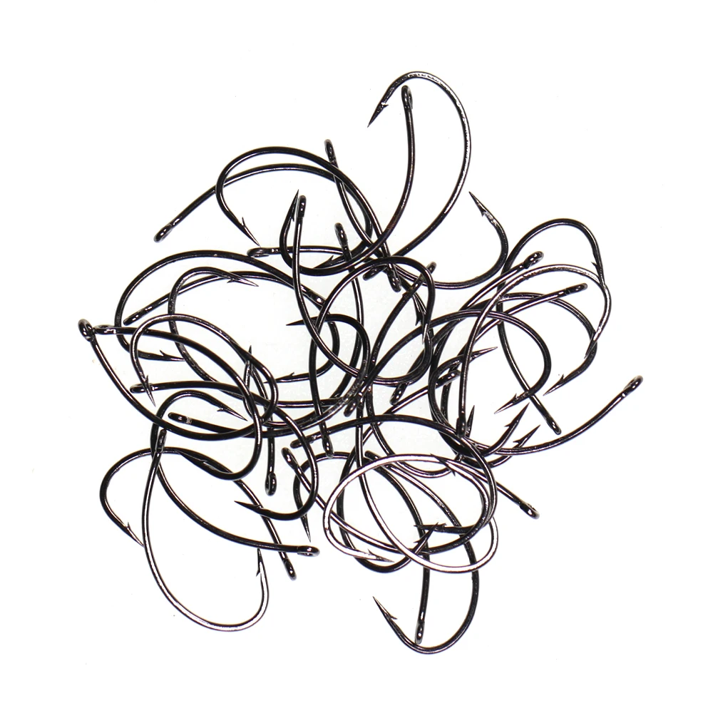 Specs: Straight eye, continuous bend, barbed, wide gap, ultra sharp, high-carbon steel, forged with black nickel finish.