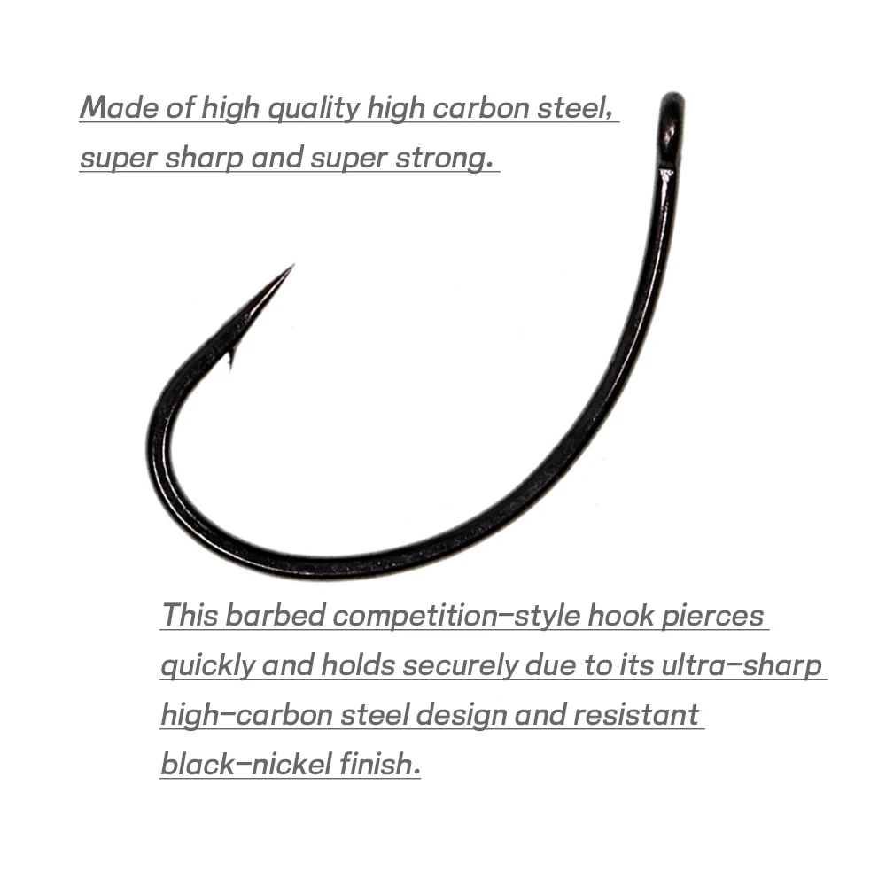 This barbed competition-style hook pierces quickly and holds securely due to its ultra-sharp high-carbon steel design and resistant black-nickel finish.