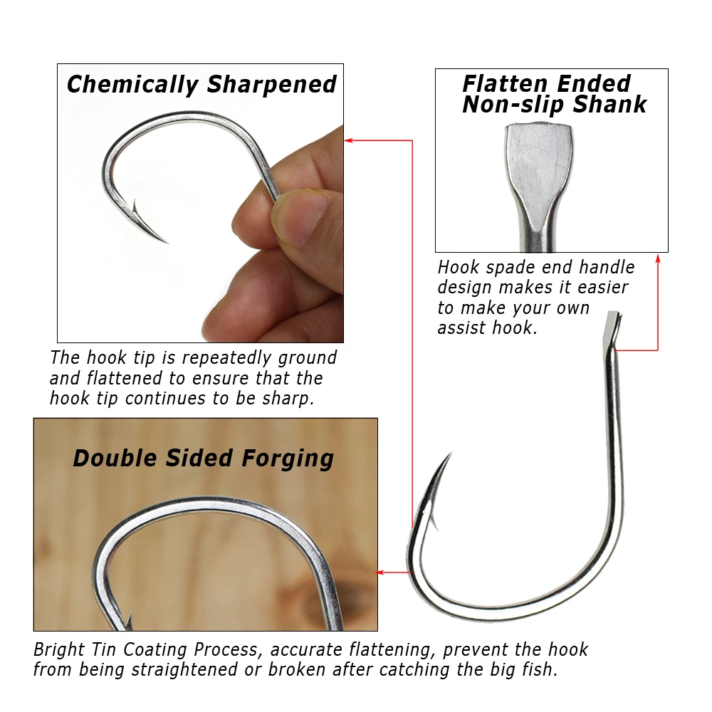 【Excelente tratamiento】: Proceso de recubrimiento de estaño brillante, aplanamiento preciso, evita que el anzuelo se enderece o se rompa después de atrapar el pez grande.