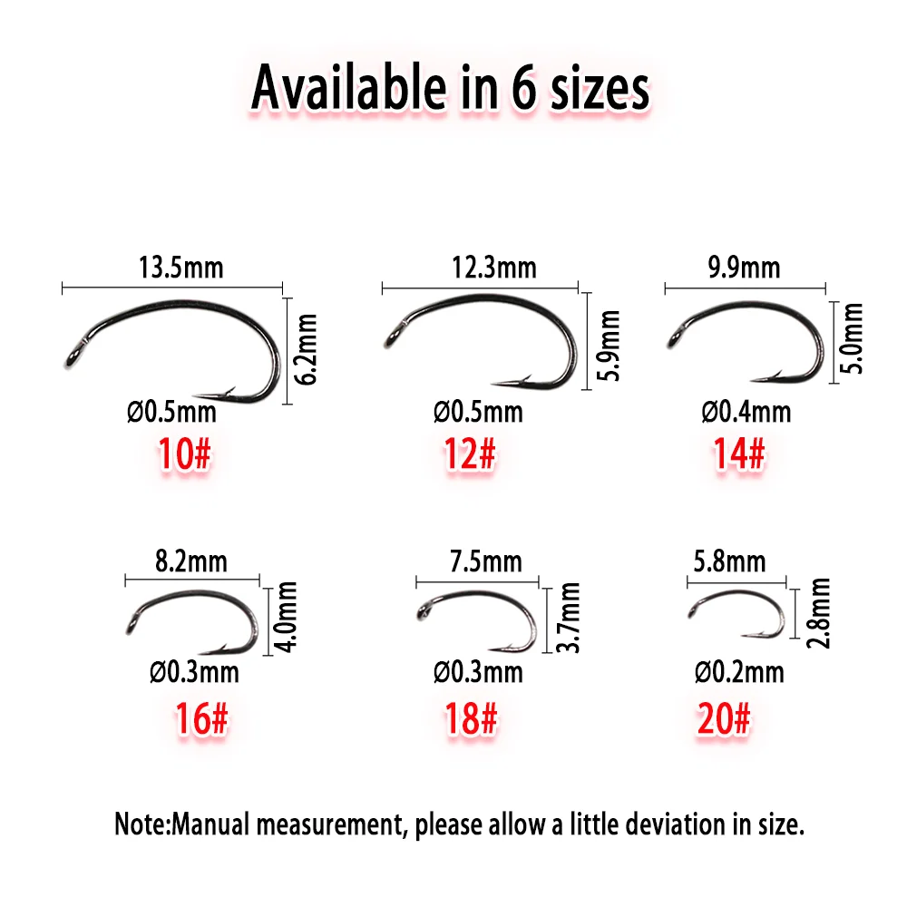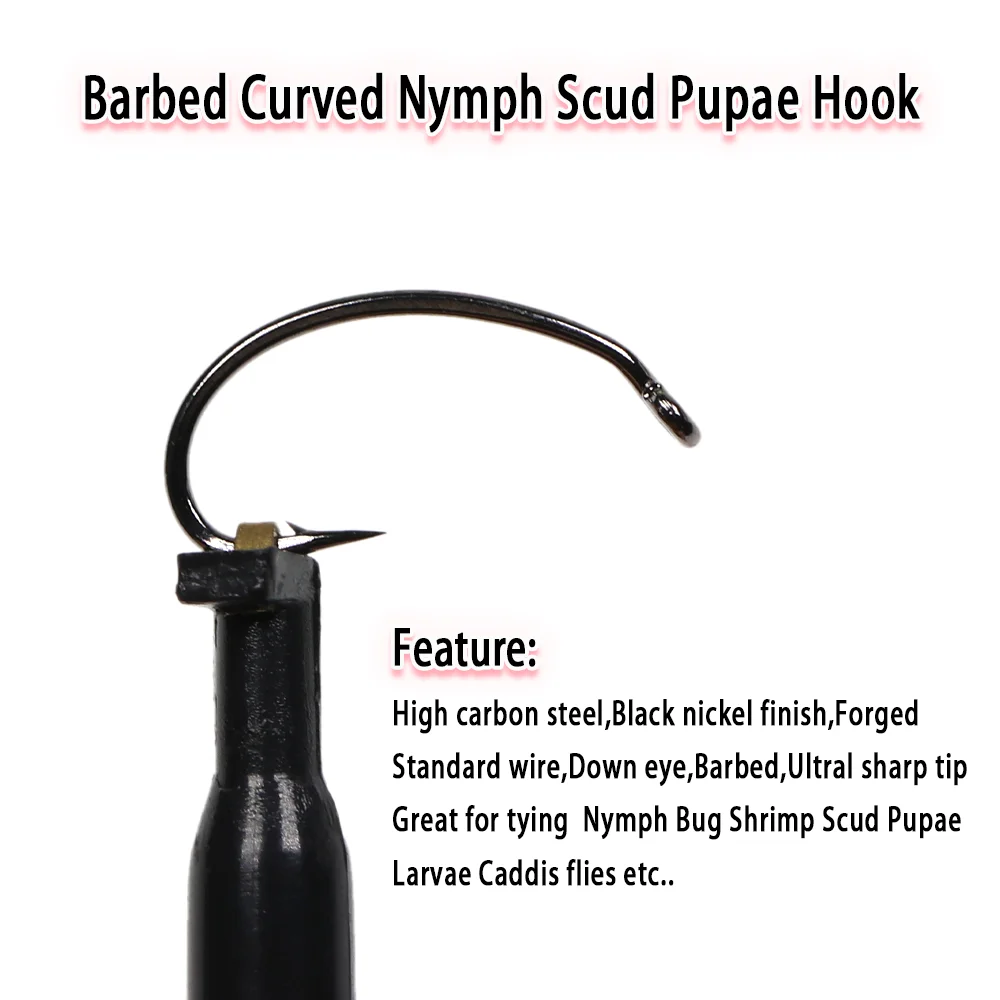 Wifreo 100 piezas ganchos curvados de atado de moscas, gancho para hacer moscas, gancho Scud Nymph, Bug Caddis Midge, gambas, Pupae, larvas, anzuelos de pesca con mosca