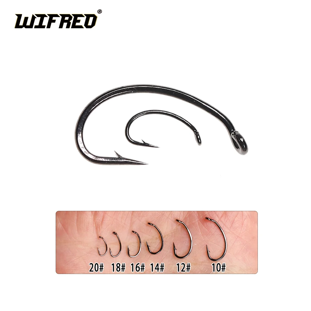 Wifreo 100 piezas ganchos curvados de atado de moscas, gancho para hacer moscas, gancho Scud Nymph, Bug Caddis Midge, gambas, Pupae, larvas, anzuelos de pesca con mosca