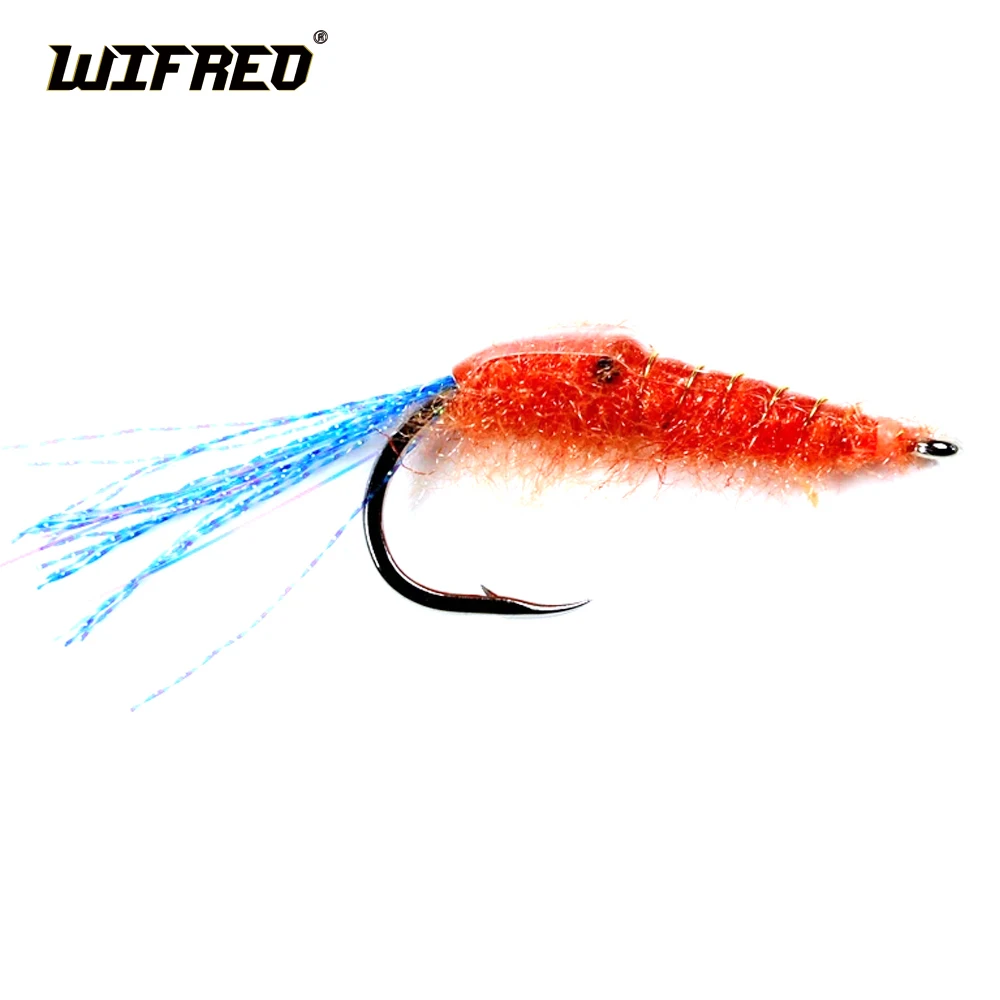 Wifreo 4 piezas 4/0 cebo de agua salada de camarón naranja pescado vuela con cola de perla cola de flashabú trucha Artificial mosca pesca ganchos perder camarones