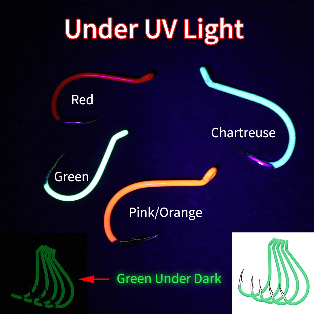 WIFREO anzuelos de pesca luminosos de acero con alto contenido de carbono, cebos de pico de pulpo offset fluorescente UV, accesorios para anzuelos de agua salada#10-#10/0