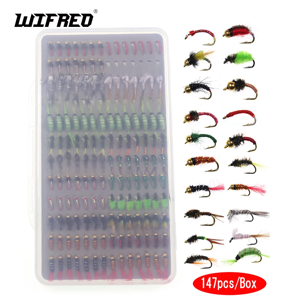 Wifreo 147, caja de señuelos de pesca con mosca Scud Nymph Wet, juego de cabeza de cuentas, ninfa Midge, larvas, trucha, Grayling, Panfish, señuelo, cebo
