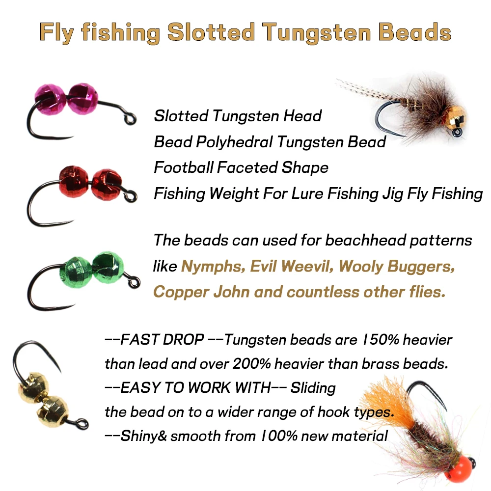 ★Caída rápida: las cuentas de tungsteno son un 150% más pesadas que el plomo y más de un 200% más pesadas que las cuentas de latón. Usa estas cuentas para tus ninfas y se hundirán mucho más rápido que con las cuentas de latón tradicionales.