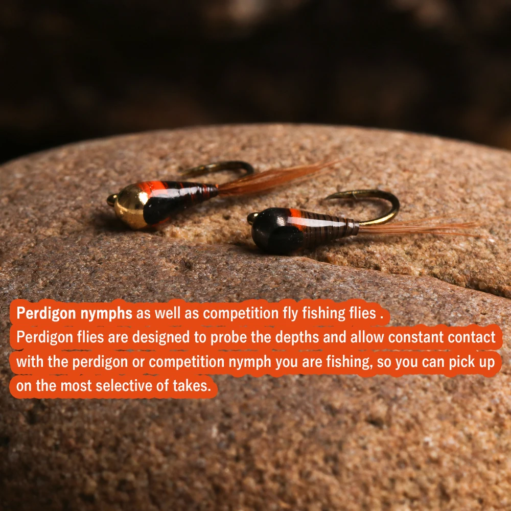 Ninfeas Perdigon así como moscas de competición de pesca con mosca.Las moscas Perdigon están diseñadas para sondear las profundidades y permitir un contacto constante con la Perdigón o la ninfa de competición que estás pescando, para que puedas recoger las tomas más selectivas.