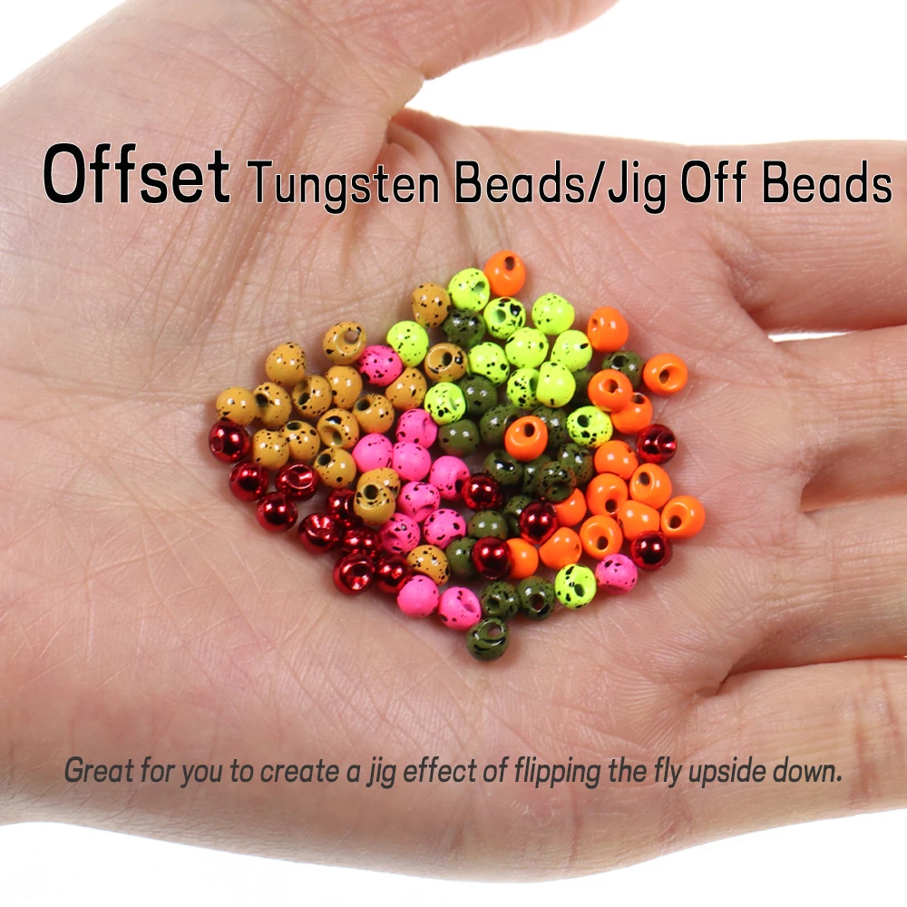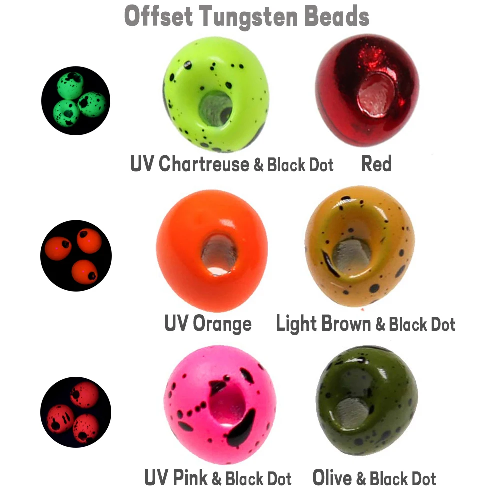 Las cuentas de tungsteno compensadas tienen forma de lágrima y están diseñadas para permitirle crear un efecto de plantilla de voltear la mosca boca abajo, sin la necesidad de usar un gancho de plantilla de ojos bajos. Estos tienen una ranura estándar y encajan en ganchos convencionales porque el 2/3 del peso está por encima del vástago del gancho.