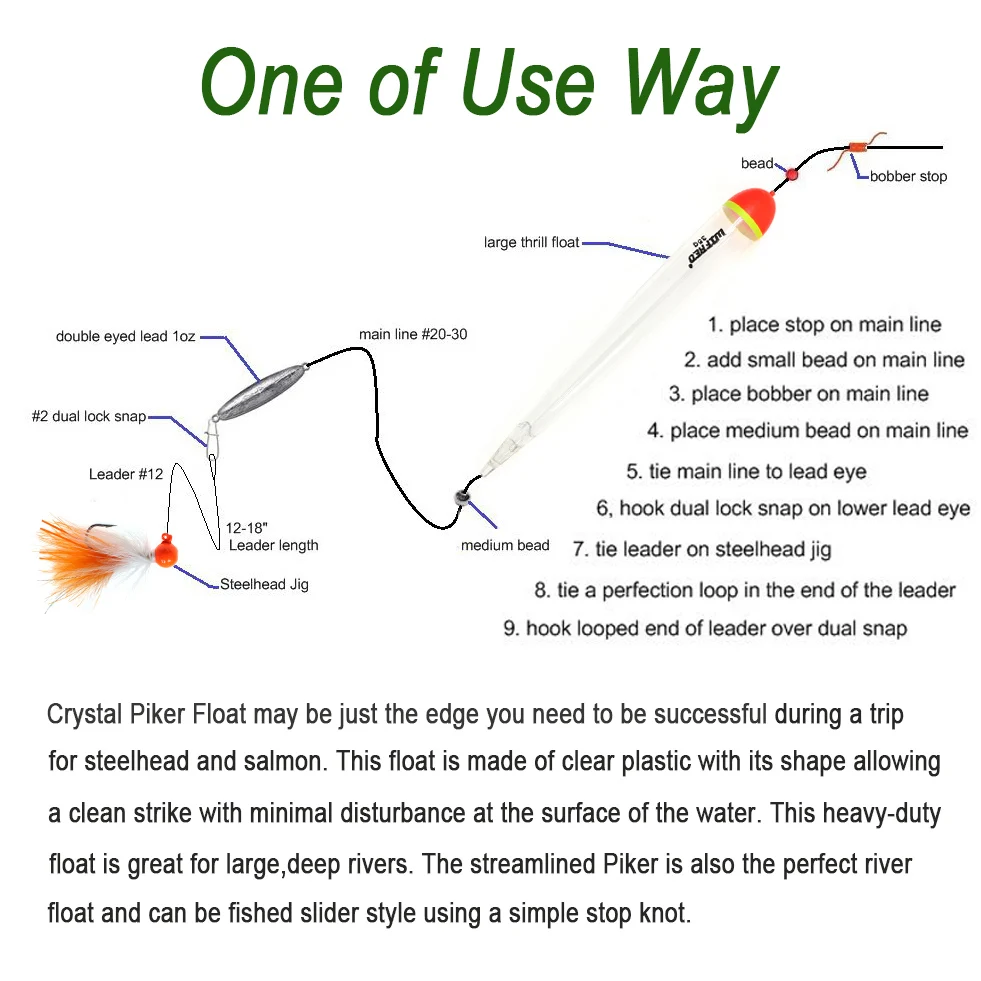 Crystal Piker Float puede ser solo el borde que necesita para tener éxito durante un viaje de cabeza de acero y salmón.Este flotador está hecho de plástico transparente con su forma que permite un golpe limpio con mínimas perturbaciones en la superficie del agua.Este flotador de alta resistencia es ideal para ríos grandes y profundos.El ciclista aerodinámico también es el flotador de río perfecto y se puede pescar con un simple nudo de parada.