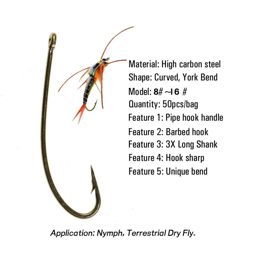 Wifreo 50PCS 3XL Long Shank Curved Nymph Fly Hook Terrestrial Dry Fly Hook for Stimulator Flies Stonefly Nymph Hook