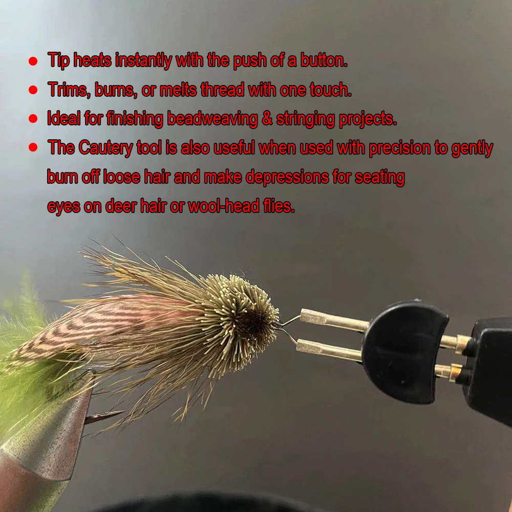 Consideramos que esta herramienta es imprescindible para usar con todas las supertrenzas, como hacemos al atar varios patrones de sanguijuela de estilo intruso y MOAL. Básicamente, esta es una herramienta de cirugía veterinaria que tiene una aplicación especial para atar moscas. La herramienta facilita el trabajo de corte de líneas Supertrenza. Cualquiera que haya trabajado con estas líneas sabe que son muy difíciles de cortar con Nuestras tijeras normales para atar moscas. Incluso las tijeras ÒSuperbraidÓ tienen dificultades para atravesar las cosas, y generalmente requieren mantener una tensión firme en la Supertrenza al aplicar ÒscissÓ para cortar el material. La herramienta de cauterización también es útil cuando se usa con precisión para quemar suavemente el cabello suelto y hacer depresiones para sentarse en el pelo de ciervo o moscas de cabeza de lana.