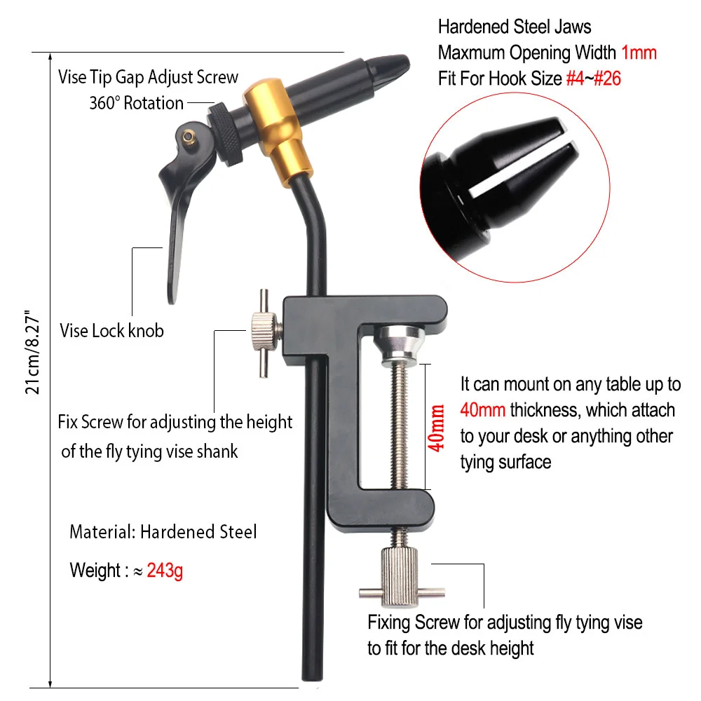 1. Este tornillo para atar moscas es fácil de usar, una abrazadera en C suave y ajustable, que se puede montar en cualquier mesa de hasta 40mm de espesor, que se unen a su escritorio o superficie de atado o alternativamente modelos de pedestal.