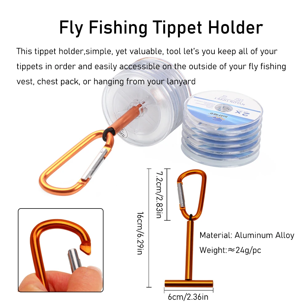 La forma más cómoda y versátil de almacenar hasta cinco de sus carretes tippet favoritos. Este diseño en "T" le permite colgar sus tippets de su cinturón o empacar con el práctico mosquetón adjunto para un fácil almacenamiento y recuperación de sus tippets.