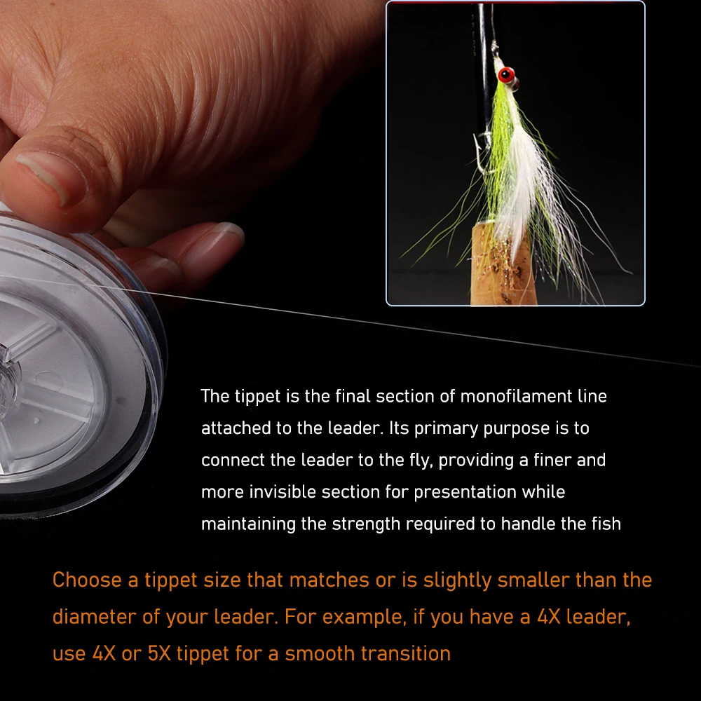El tippet es la sección final que conecta la línea principal a sus moscas. El material de nylon tiende a ser un poco más suave y más flexible, y generalmente es más fácil atar nudos seguros.