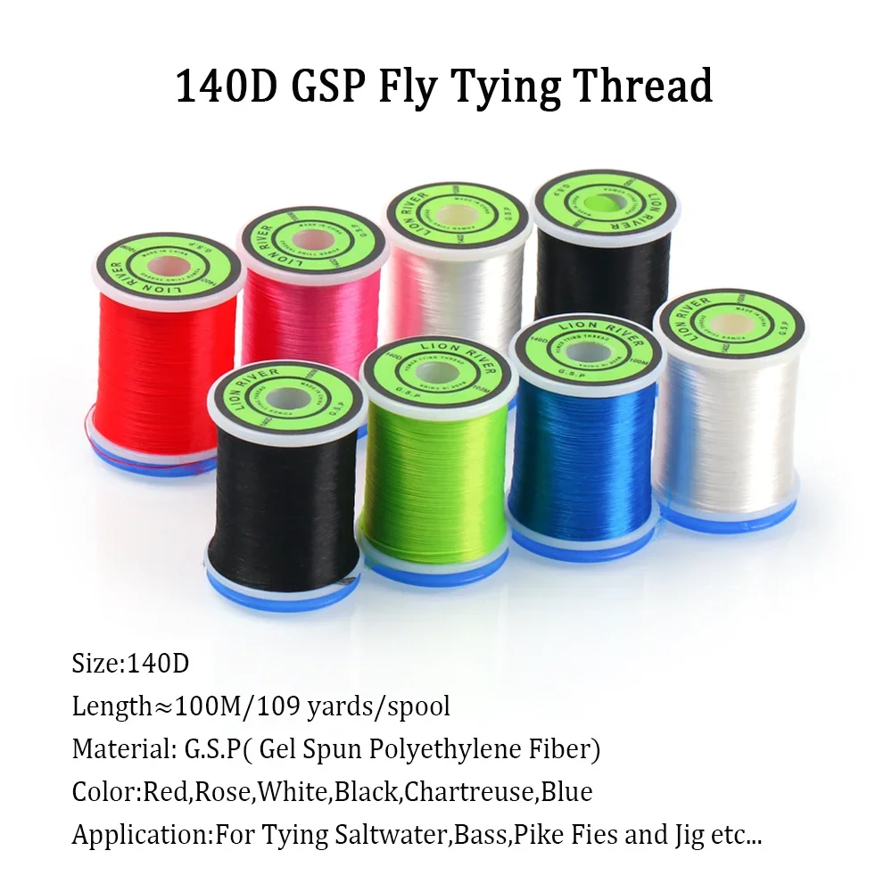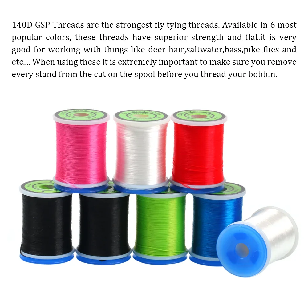 Los hilos 140D GSP son los hilos más fuertes para atar moscas. Disponible en los 6 colores más populares, estos hilos tienen una resistencia superior y son planos. Es muy bueno para trabajar con cosas como pelo de ciervo, agua salada, lubina, moscas de Lucio, etc.... Al usarlos, es extremadamente importante asegurarse de quitar cada soporte del corte en el carrete antes de enhebrar la bobina.