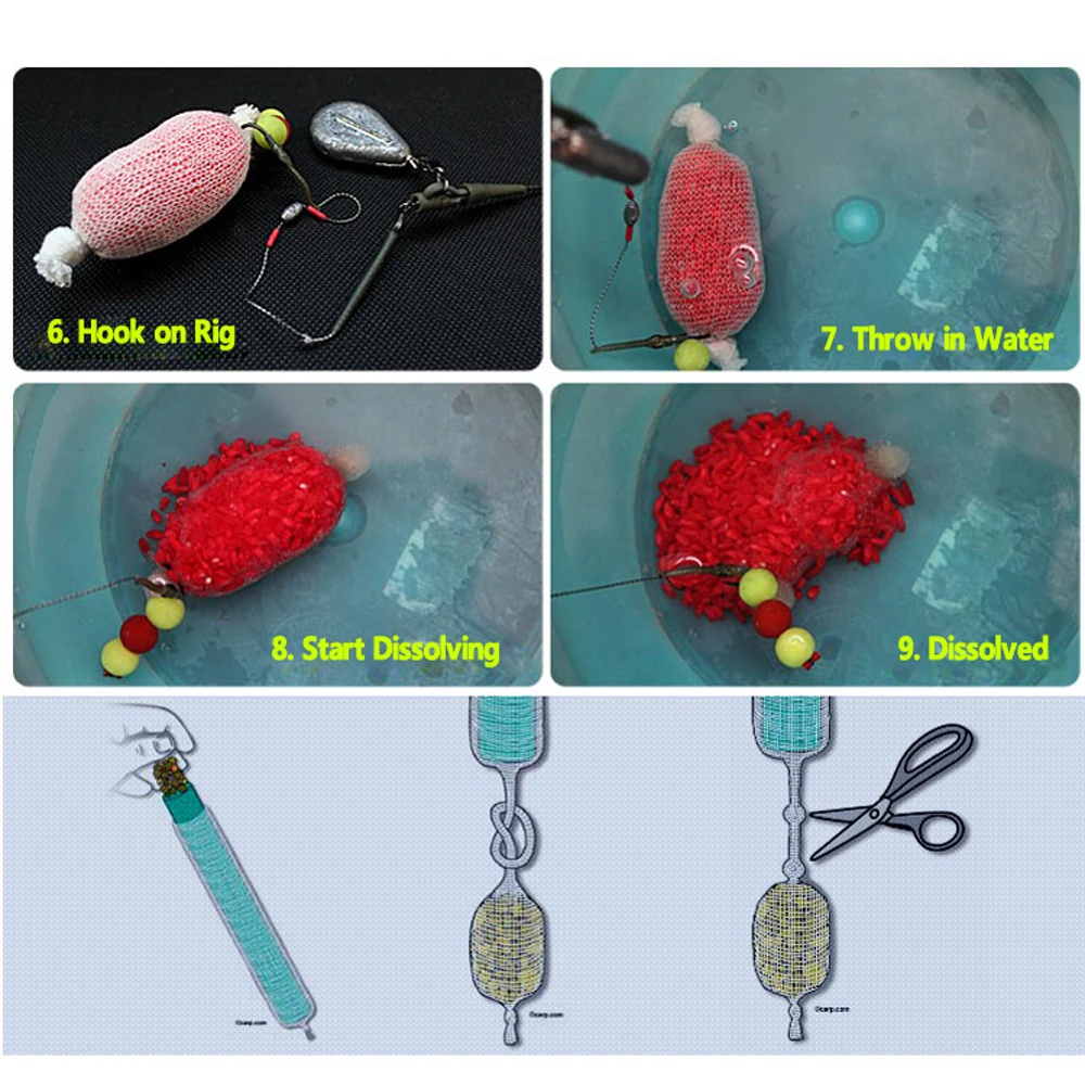 La materia prima es PVA, que se derretirá y descompondrá inmediatamente después de entrar en el agua. Su construcción de micromalla lo hace ideal para microgránulos, gusanos, triturados o pequeños cebos de partículas y tierra. Se puede cargar con cebo y llevar al gancho. Cuando se arroje al agua, la bolsa se derretirá. El anzuelo está oculto en la pila del cebo. El pez come el cebo e inhala el anzuelo.