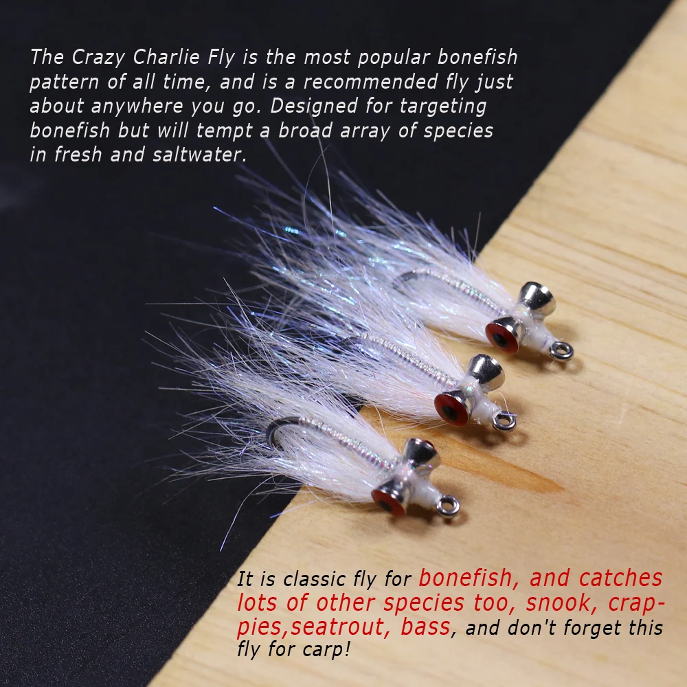 El Crazy Charlie Fly es el patrón de pez bonefish más popular de todos los tiempos, y es una mosca recomendada en cualquier lugar que vaya. Un patrón simple pero productiva, atado con ojos de mancuerna de latón, ala de oropel flashabou, un cuerpo de ribbing llamativo que se combinan para dar vida y durabilidad A esta mosca. Perfecto para pescar peces bonefish, pero tentará a una amplia variedad de especies en agua dulce y salada.