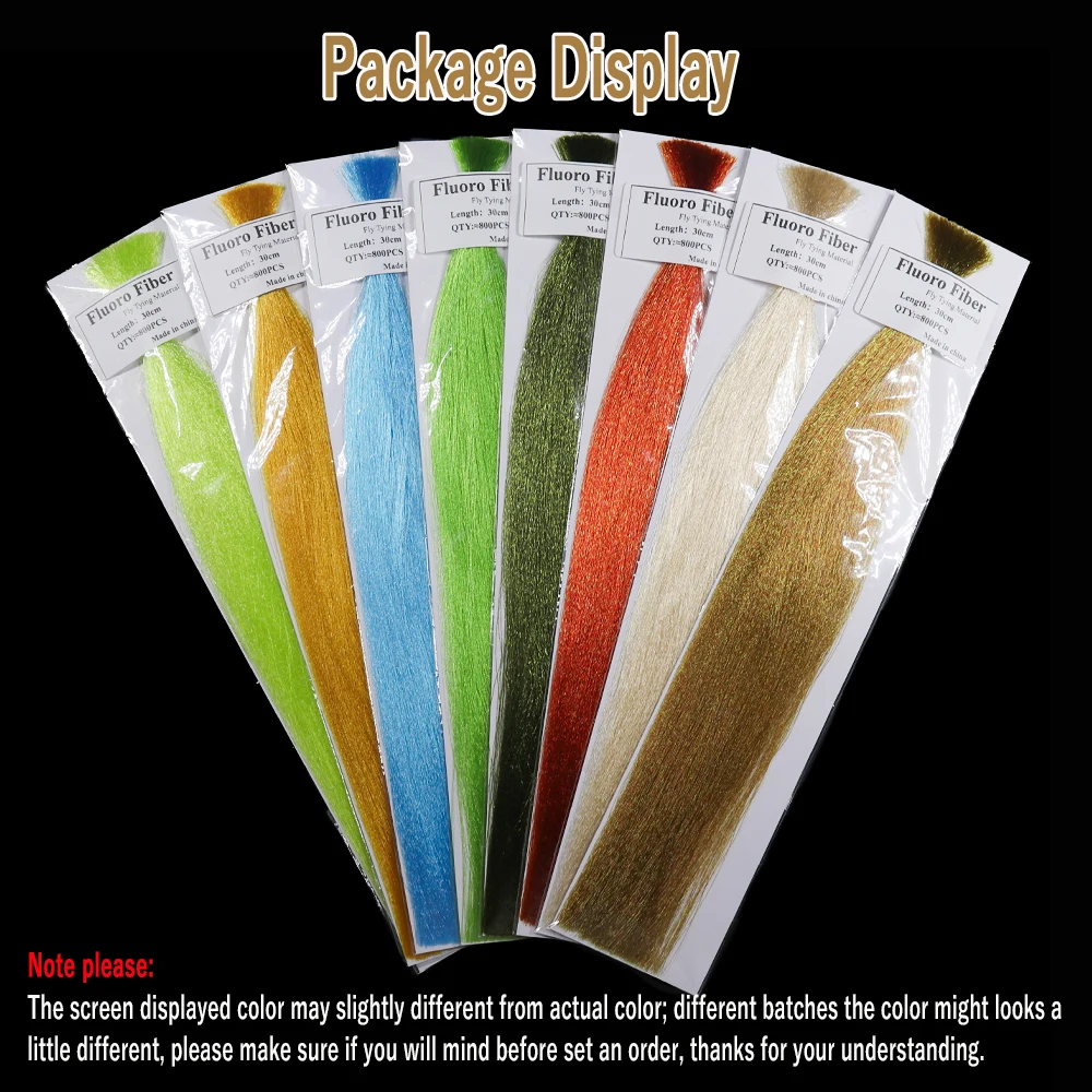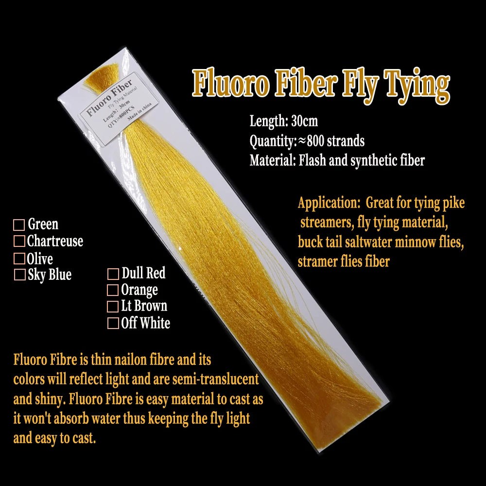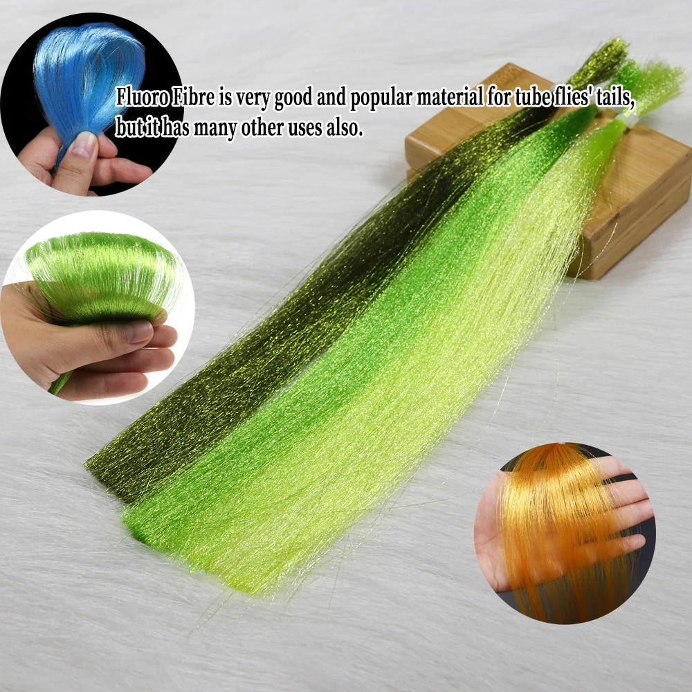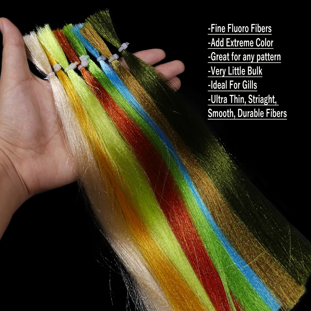 Fluoro Fibre es una fina fibra de nailon y sus colores reflejarán la luz y son semitranslúcidos y brillantes.Fluoro Fiber es un material fácil de lanzar, ya que no absorbe agua, manteniendo así la mosca ligera y fácil de lanzar.