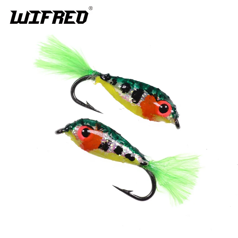Wifreo 2PCS#10 Mini Minnow Fly 3D ojos brillantes Minnow cebo peces flores de imitación trucha de agua dulce mosca pesca moscas