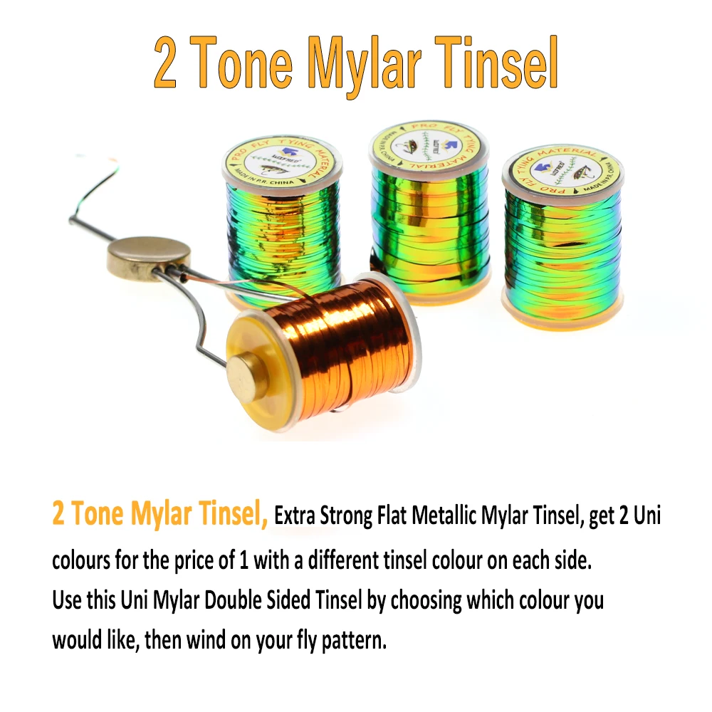 2 Tono Mylar Tinsel,Oropel Mylar metálico plano extra fuerte, obtenga 2 colores Uni por el precio de 1 con un color de oropel diferente en cada lado. Use este oropel Uni Mylar de doble cara eligiendo el color que desee, luego enrolle su patrón de moscas.