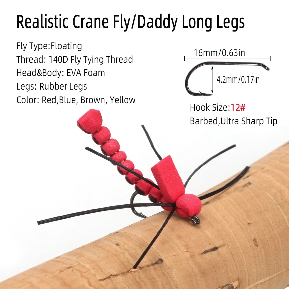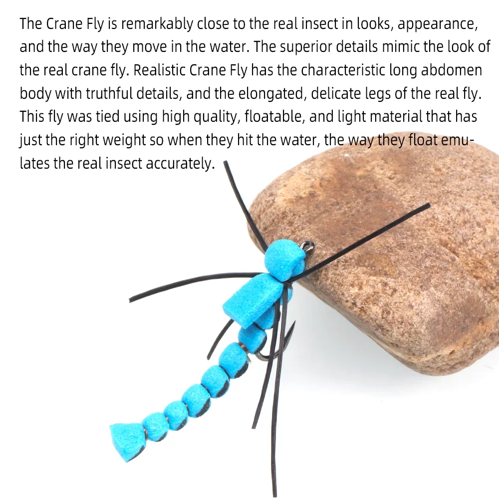 La mosca de la grúa está muy cerca del insecto real en apariencia, apariencia y la forma en que se mueven en el agua. Los detalles superiores imitan el aspecto de la mosca de la grúa real. Realista Crane Fly tiene el característico del abdomen con cuerpo largo detalles veraces, y las piernas alargadas y delicadas de la mosca real. Esta mosca se ató con material de alta calidad, flotante y ligero que tiene el peso justo para cuando golpean el agua, la forma en que flotan emula al insecto real con precisión.