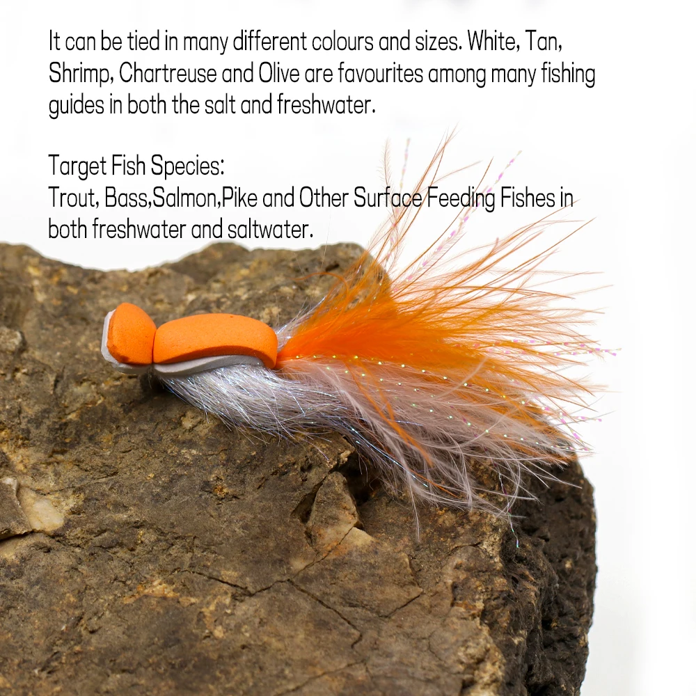 Se puede atar en muchos colores y tamaños diferentes. Blanco, tostado, camarones, chartreuse y oliva son los favoritos entre muchos guías de pesca tanto en sal como en agua dulce.
