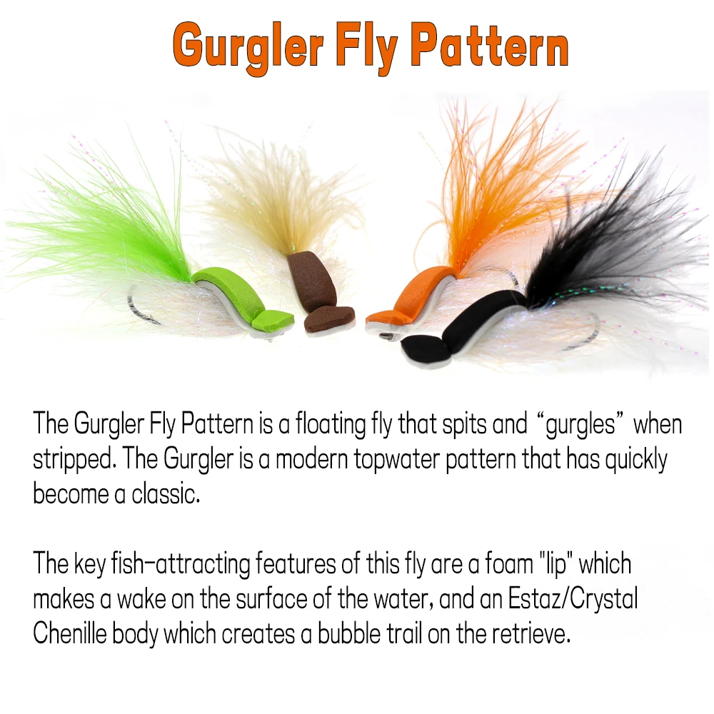 El patrón de moscas gurgler es una mosca flotante que escupe y "gorgotea" cuando se quita. El Gurgler es un patrón moderno que se ha convertido rápidamente en un clásico. Las características clave para atraer peces de esta mosca son un "labio" de espuma que hace una estela en la superficie del agua, Y un cuerpo de Estaz/Crystal Chenille que crea un rastro de burbujas en la recuperación.