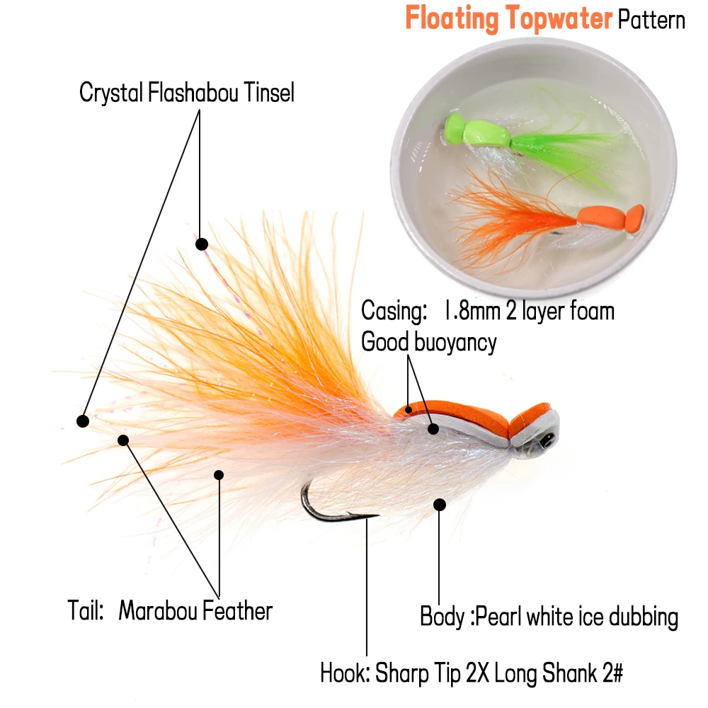 Especies de peces objetivo: Trucha, lubina, salmón, lucio y otros peces de alimentación de superficie tanto en agua dulce como salada.