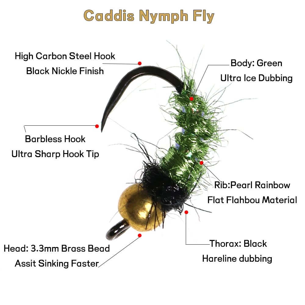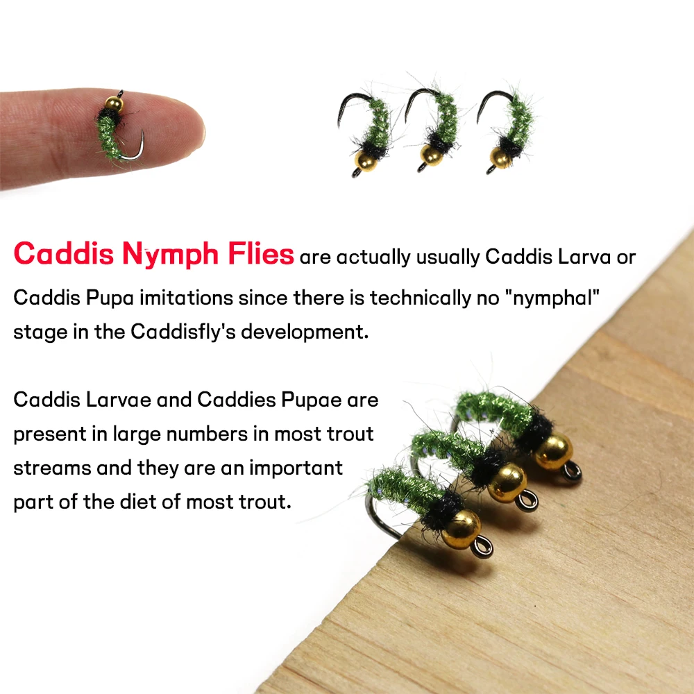 Las moscas Caddis Nymph son generalmente imitaciones de Caddis Larva o Caddis Pupa, ya que técnicamente no hay etapa "nymphal" en el desarrollo de Caddisfly. Las larvas y Caddies Pupae de Caddies están presentes en gran cantidad en la mayoría de los flujos de truchas y son una parte importante de la dieta de la mayoría de las truchas.