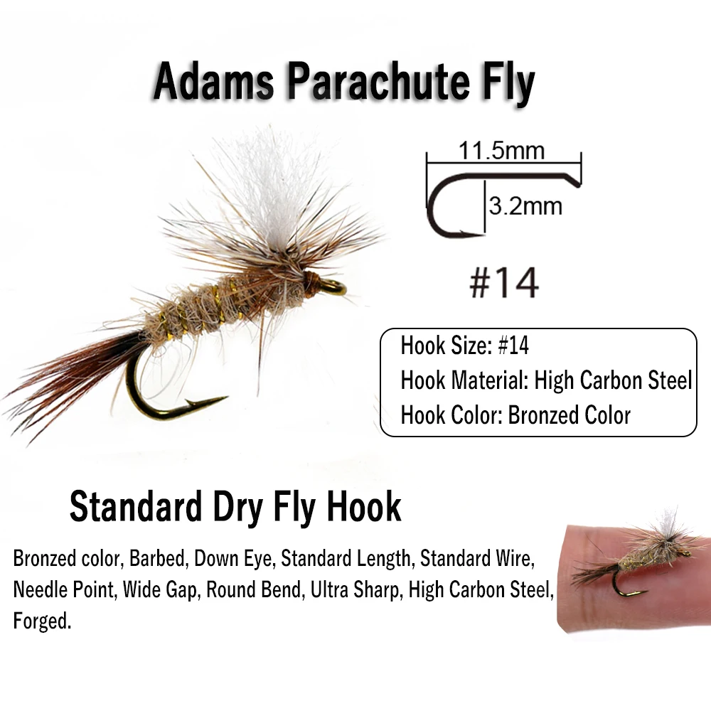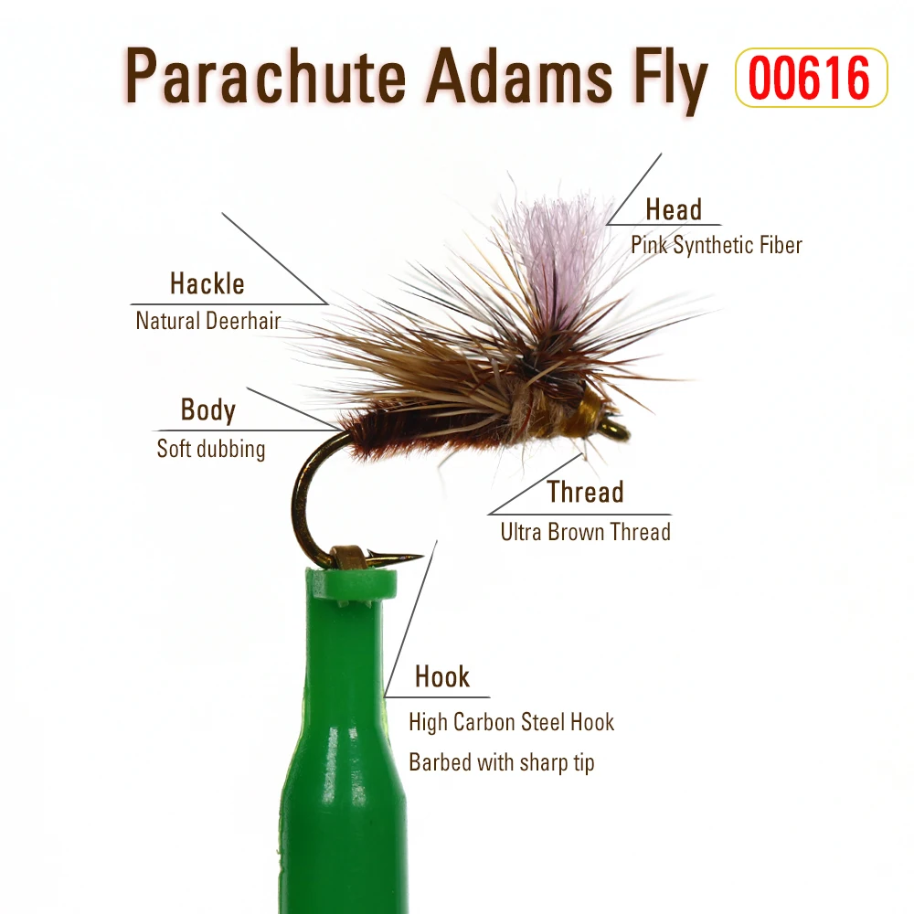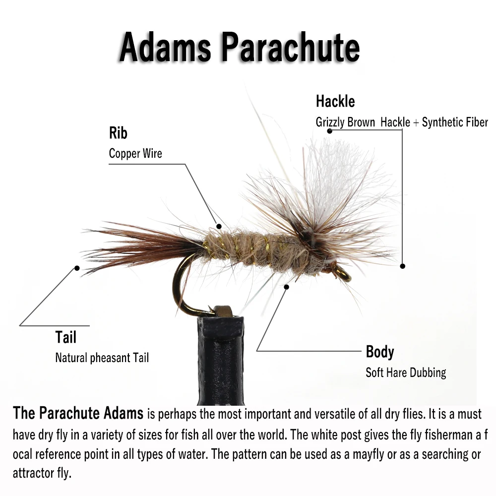 El paracaídas Adams es quizás la más importante y versátil de todas las moscas secas. Es imprescindible tener mosca seca en una variedad de tamaños para peces de todo el mundo. El poste blanco le da al pescador con mosca un punto de referencia focal en todo tipo de agua. El patrón se puede utilizar como una mosca de mayo o como Mosca de búsqueda o atracción.