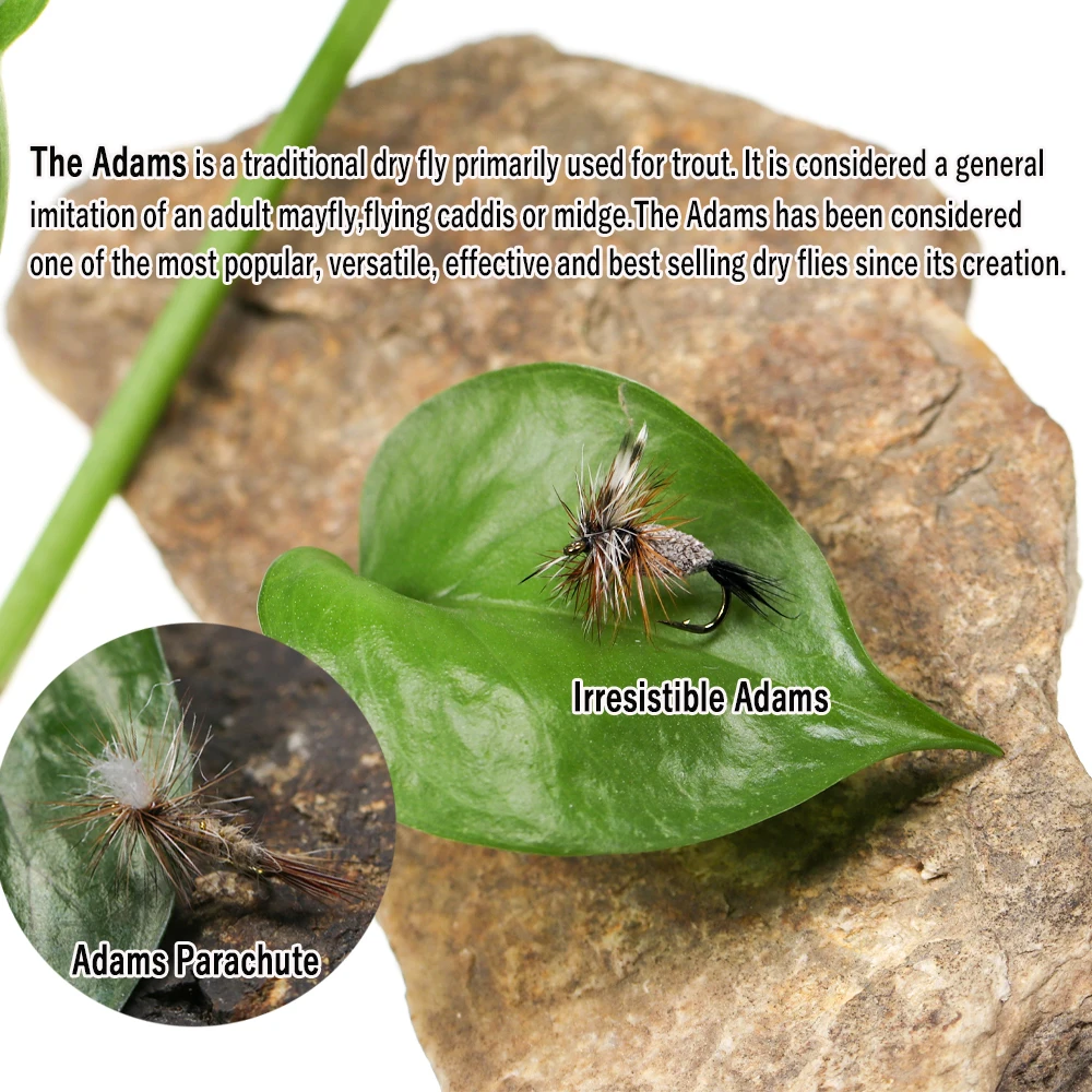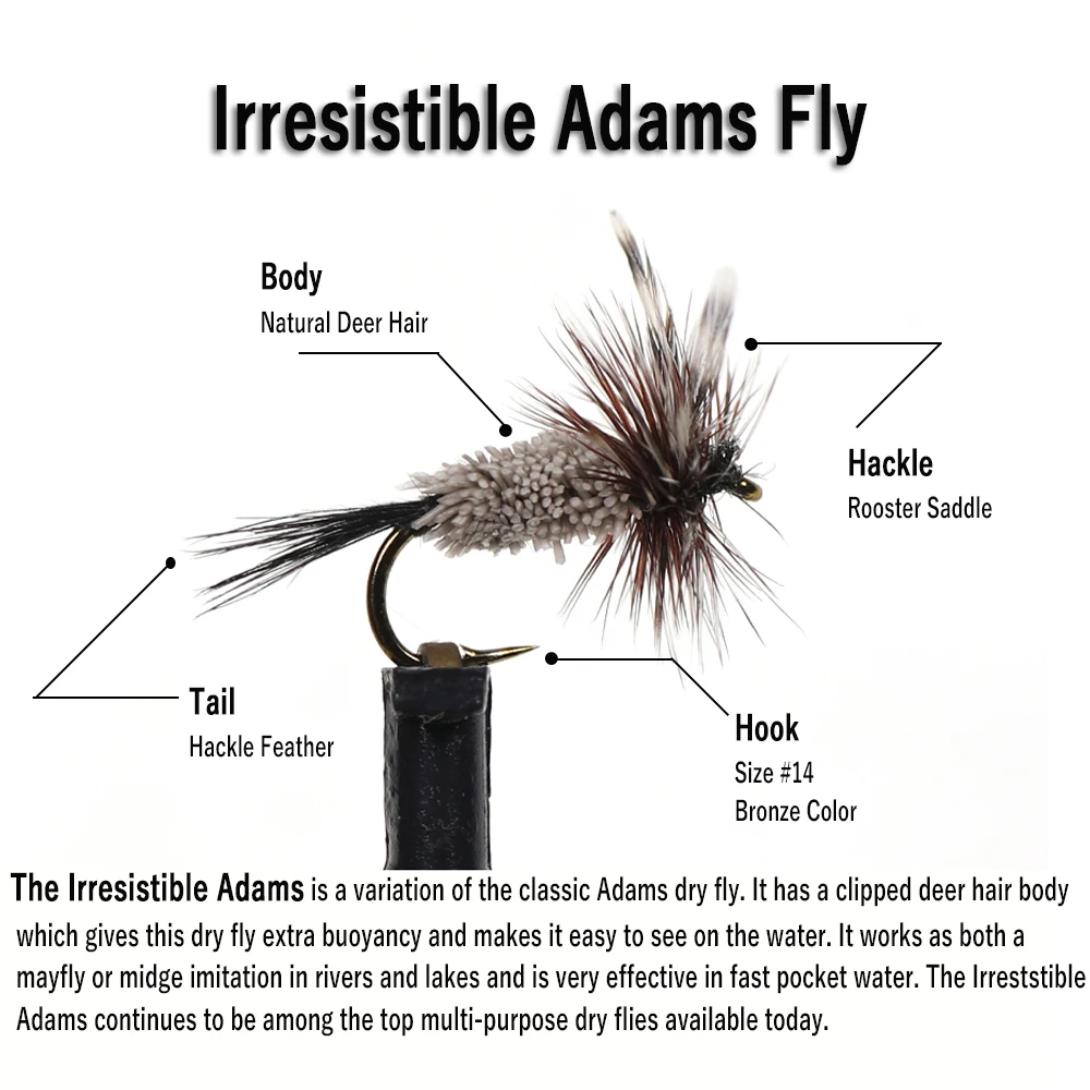 La Irresistible Adams es una variación de la clásica mosca seca Adams. Tiene un cuerpo de pelo de ciervo recortado que le da a esta mosca seca una flotabilidad adicional y hace que sea fácil de ver en el agua. Funciona tanto como una imitación de mosca de mayo o mosquitos en ríos y lagos y es muy eficaz en el agua de bolsillo rápido. El Irreststible Adams sigue estando entre las mejores moscas secas multiusos disponibles en la actualidad.