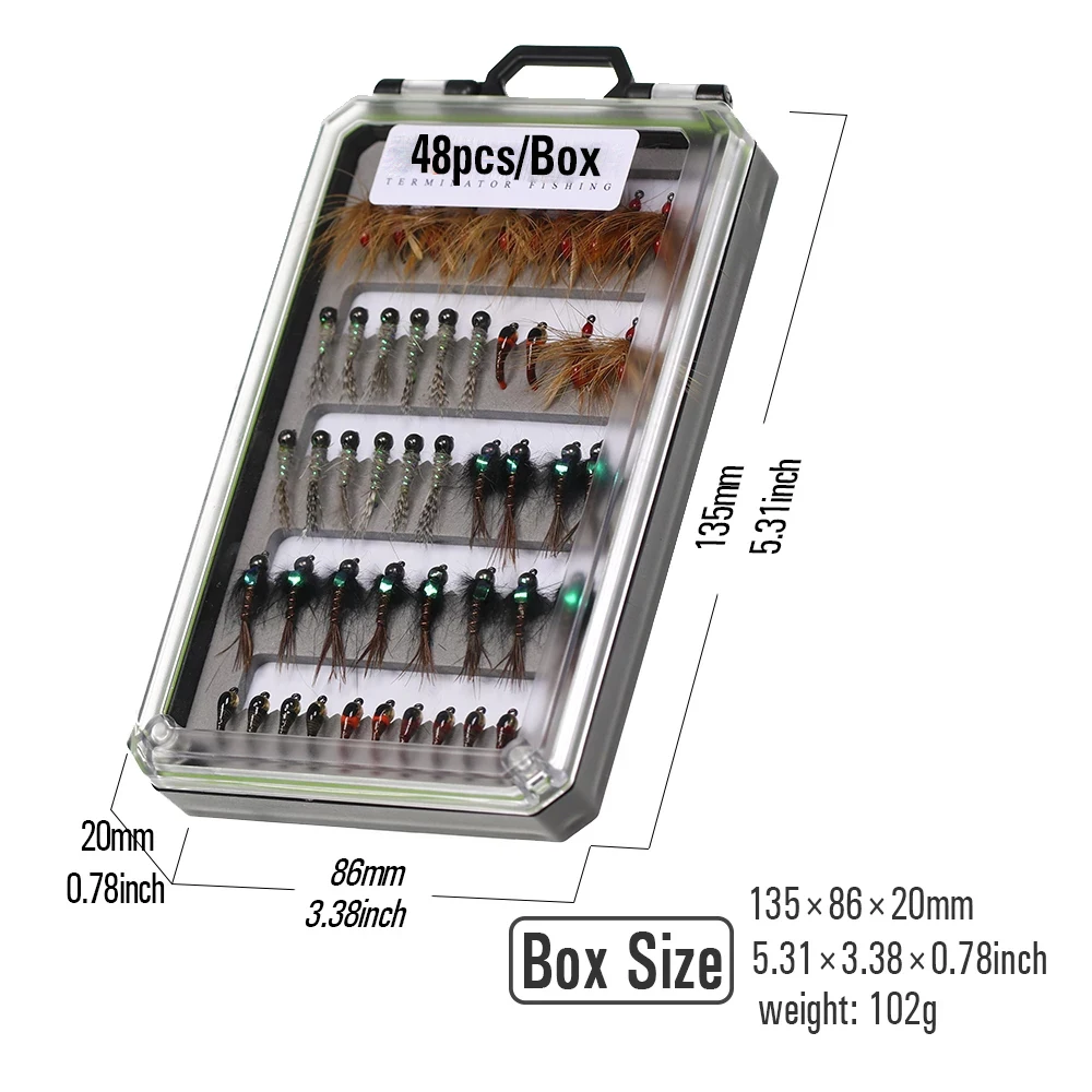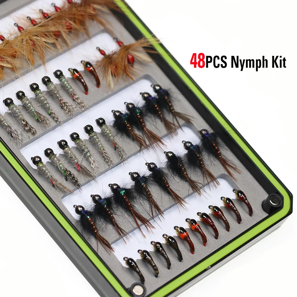 2. El kit de moscas ninfas de 48 piezas está lleno de ninfas variadas que están atadas a mano y cuentan con ganchos redondos.