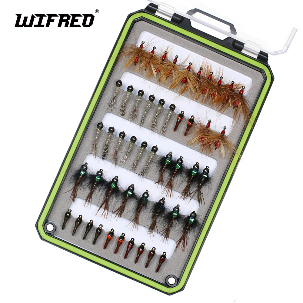 Wifreo 48 Uds anzuelo sin púas Euro Ninfa Kit tungsteno/cobre Beadhead Jig Perdigon ninfas hormiga mosca trucha pesca señuelos cebos