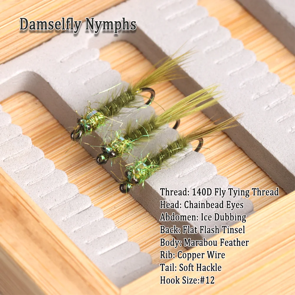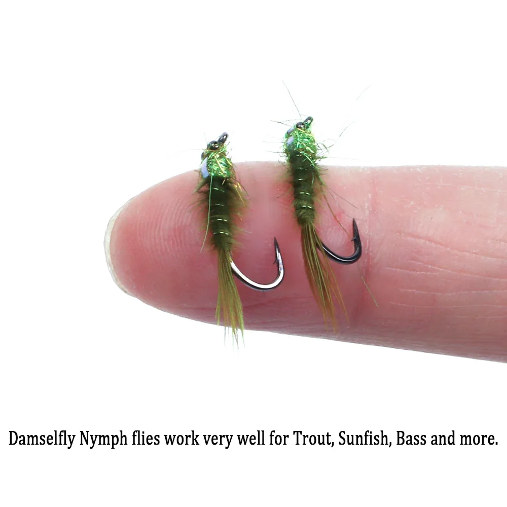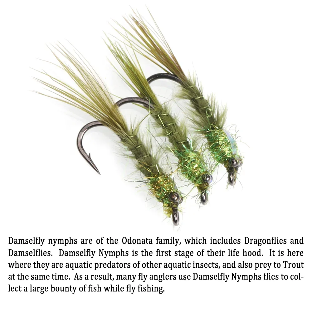 Las ninfas Damselfly son de la familia Odonata, que incluye libélulas y caballitos del diablo. Damselfly Nymphs es la primera etapa de su capucha de vida. Es aquí donde son depredadores acuáticos de otros insectos acuáticos, y también presa de La trucha al mismo tiempo. Como resultado, muchos pescadores de moscas usan moscas Damselfly Nymphs para recolectar una gran cantidad de peces mientras pescan con mosca.