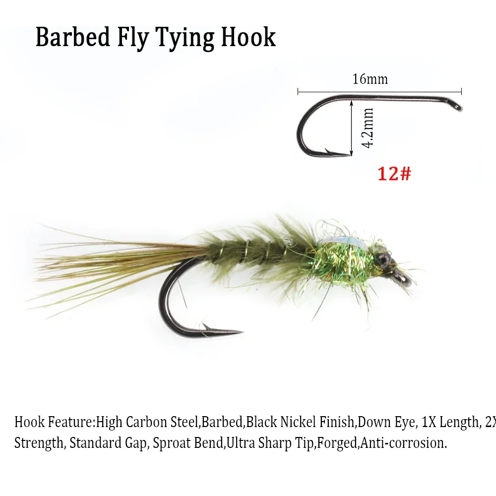Características del gancho: púas, acabado de níquel negro, Ojo de abajo, 1X longitud, fuerza 2X, espacio estándar, curva de Sproat, Punta ultra afilada, forjado, anticorrosión.