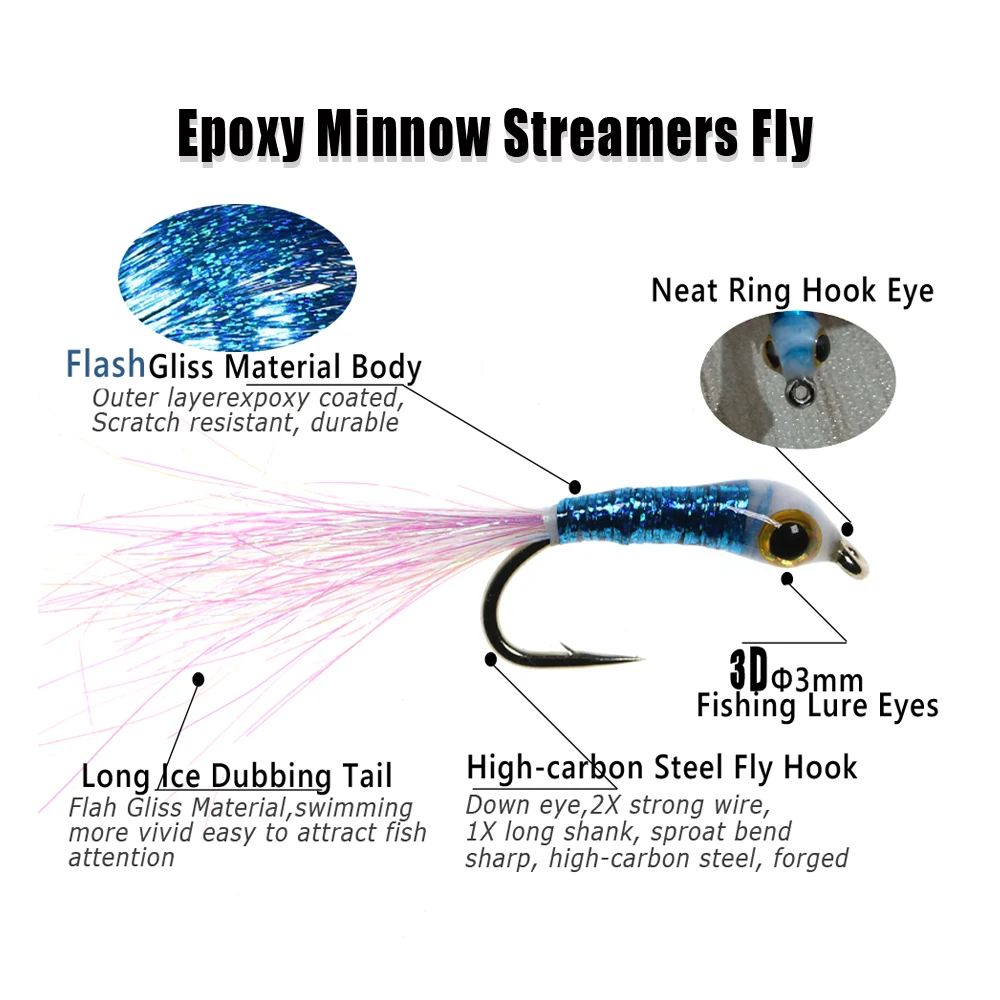------ El pececillo epoxi es una mosca artificial comúnmente clasificada como una serpentina y se pesca bajo la superficie del agua. Es un patrón popular y ampliamente utilizado para peces de juego de agua dulce y agua salada y generalmente está listado como uno de los patrones más populares para tener en cualquier caja de moscas, especialmente para la pesca de bajos y agua salada.