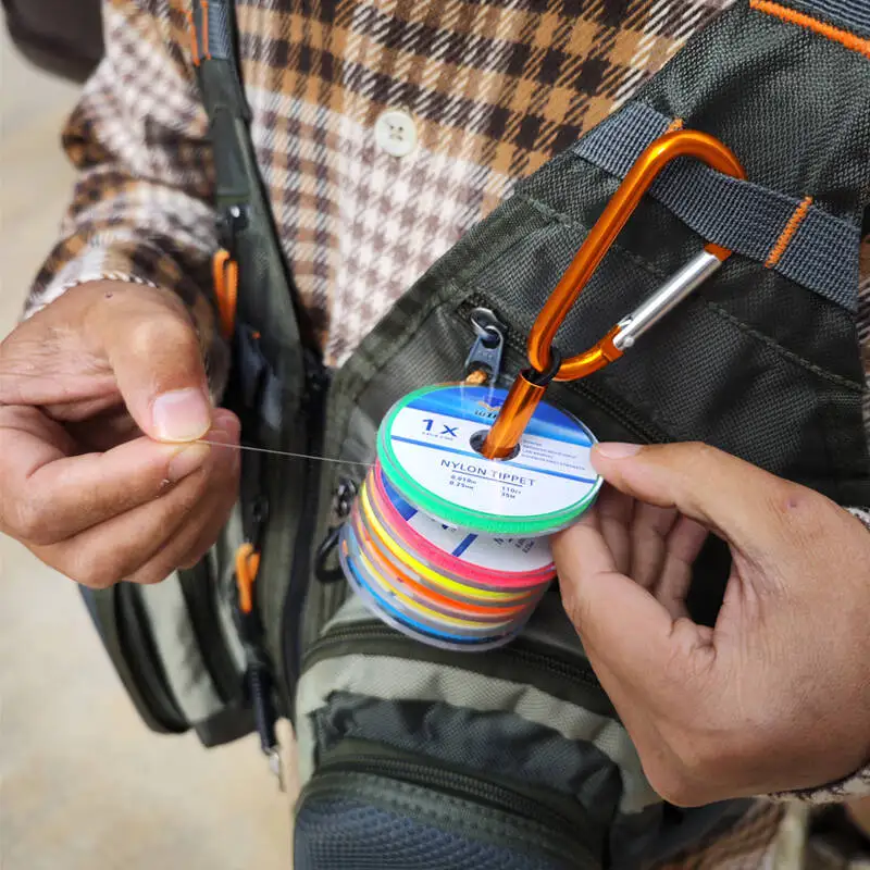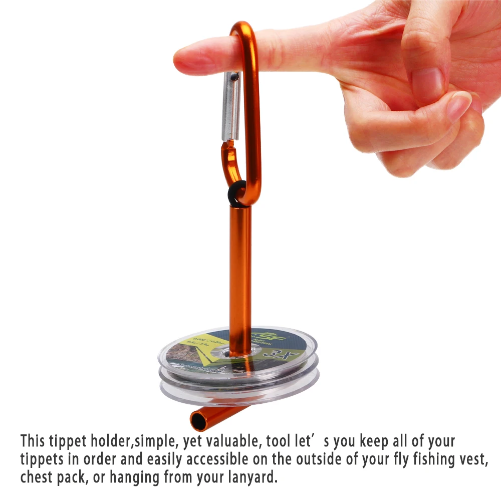 Cansado de buscar en los bolsillos y compartimentos tratando de encontrar el tippet adecuado. Este soporte para tippets, simple pero valioso, le permite mantener todos sus tippets en orden y de fácil acceso en el exterior de su chaleco de pesca con mosca, paquete de pecho, o colgando de su cordón.