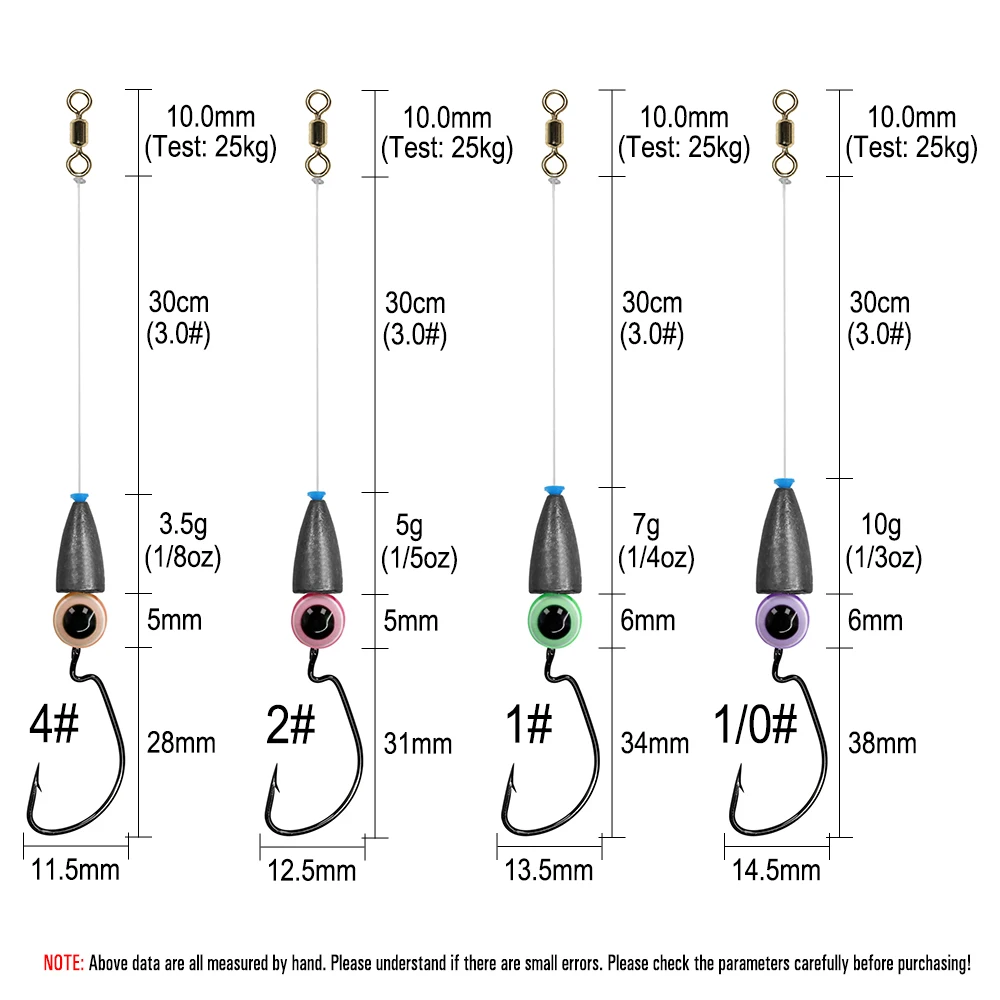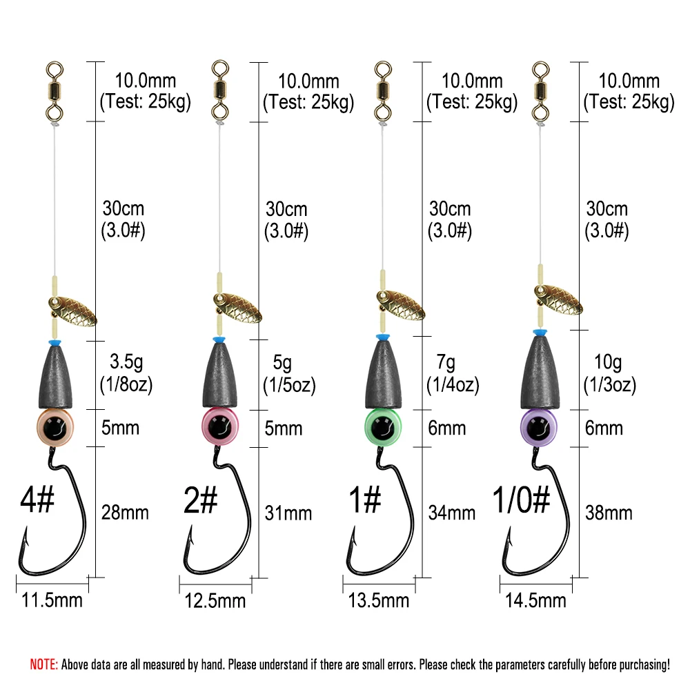 Tamaño: 3,5 g (1/8 oz); 5 g (1/5 oz), 7 g (1/4 oz); 10 g (1/3 oz), 14 g (1/2 oz) (se distinguir como peso de plomo).