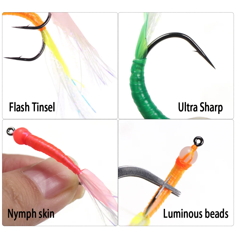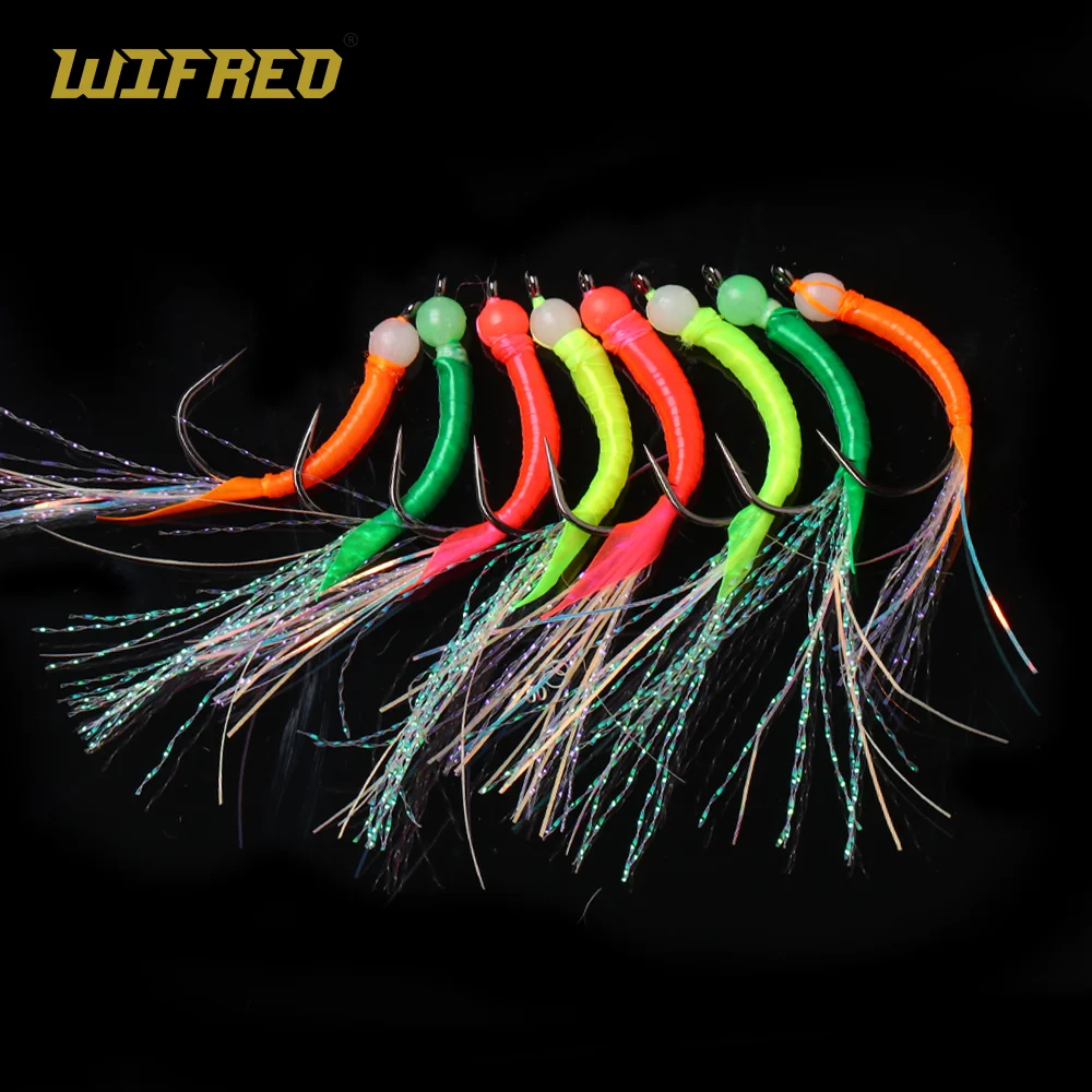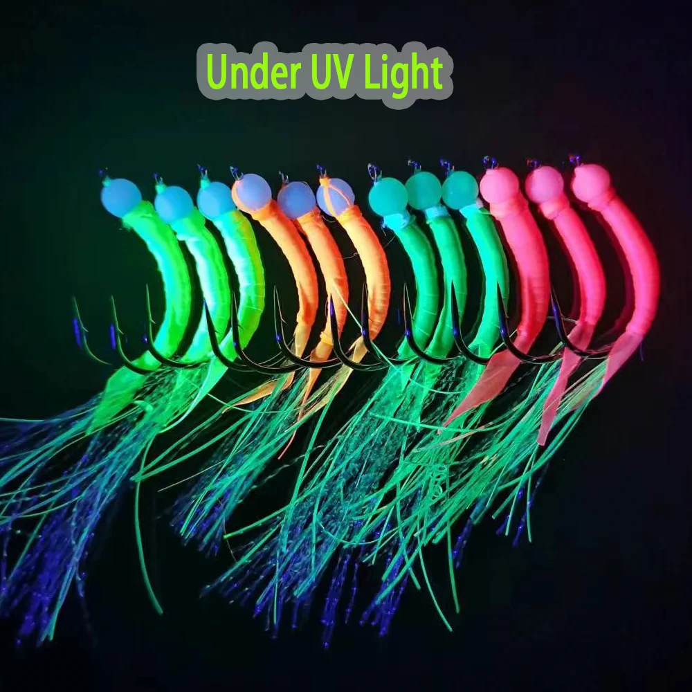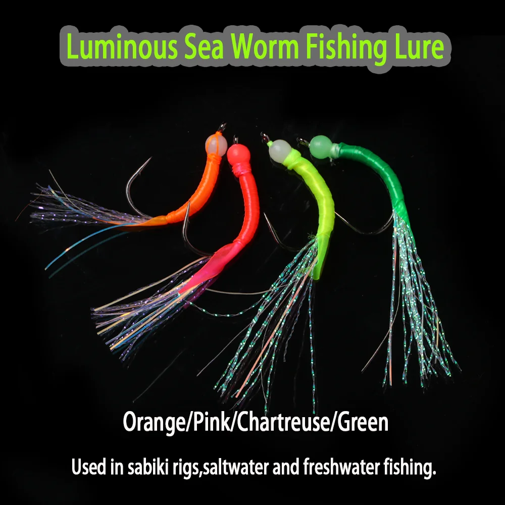 WIFREO 8 Uds. Ver de mar luminoso moscas de pesca de agua salada con cuentas luminosas torcidas Flash oropel Maylar oropel cola trucha lubina señuelo de pesca