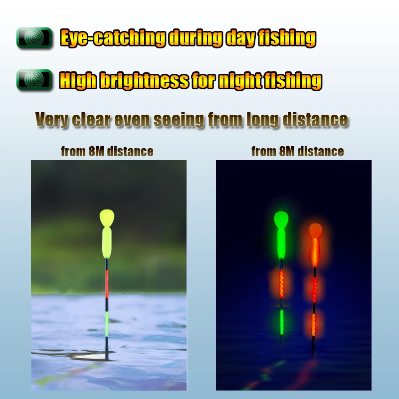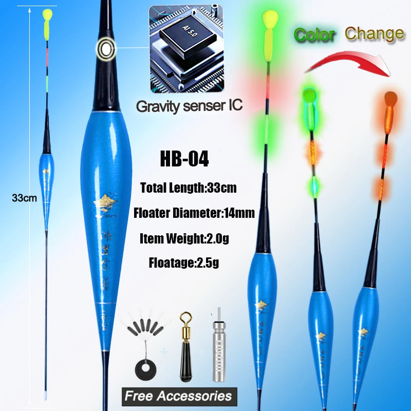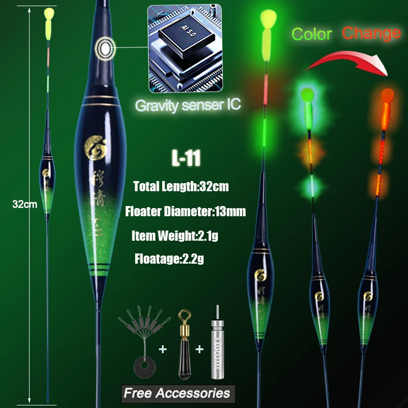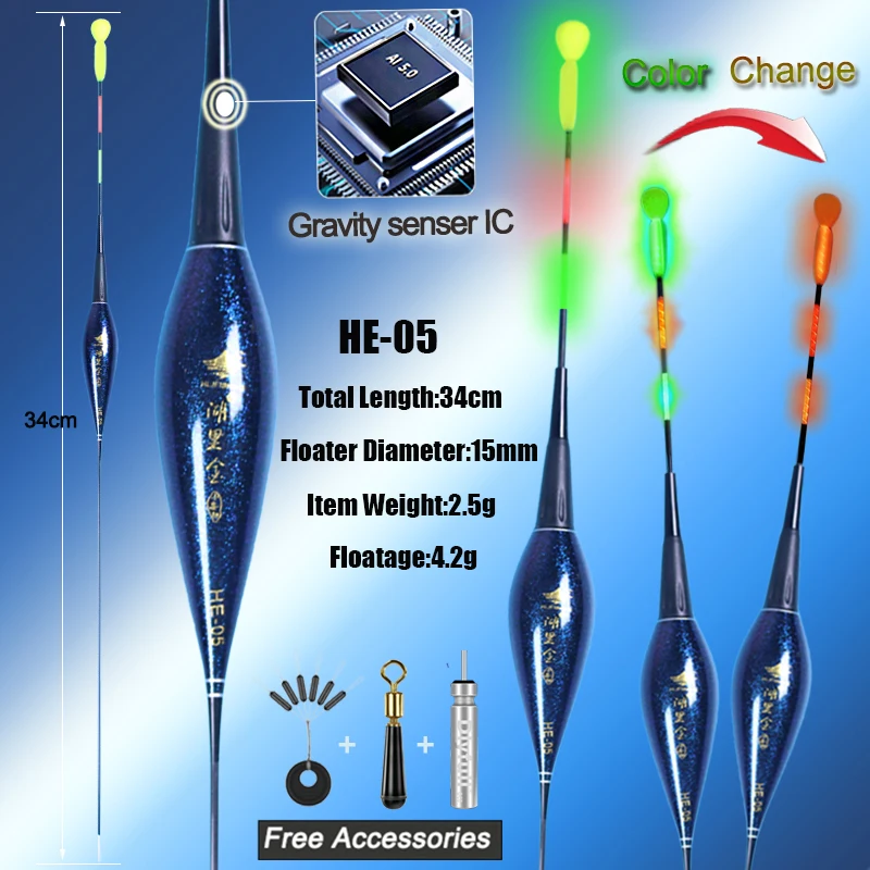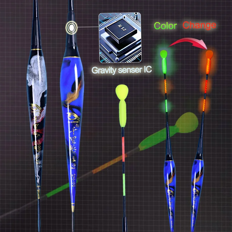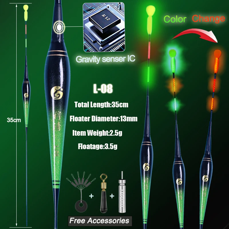 * Nuevo diseño, flotadores de pesca inteligentes, función de sensor de gravedad.*Mejora de la fuente de luz para pescar durante mucho tiempo, durabilidad de la batería extendida en 3-5 horas, tiempo de inducción de los cebos de solo 0,01 s.*Cuando el pez muerde, el color de las luces cambia de verde a rojo.*Fibra óptica de alto brillo, buen rendimiento en transmisión de luz.*Trajes para diversos entornos de pesca.Especificaciones: