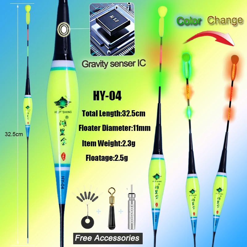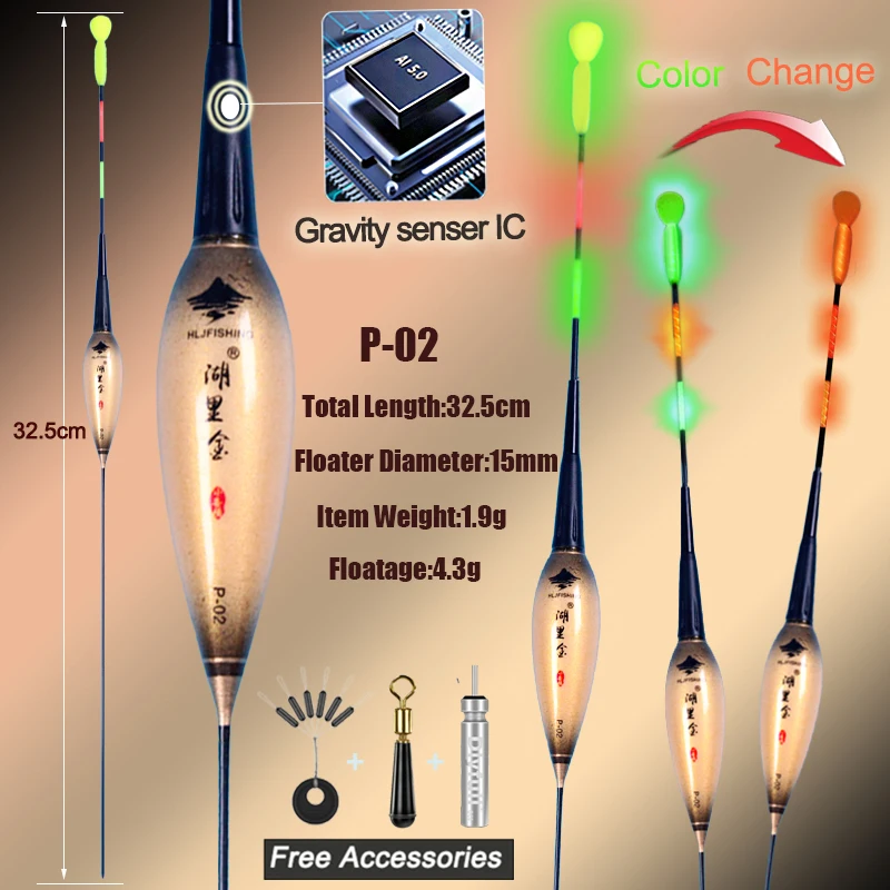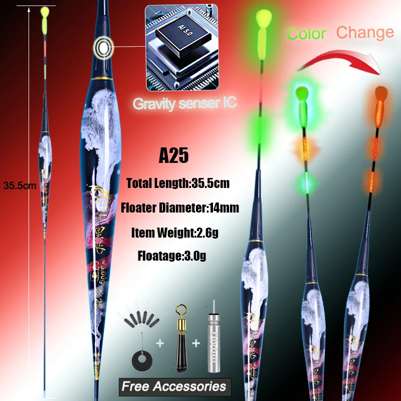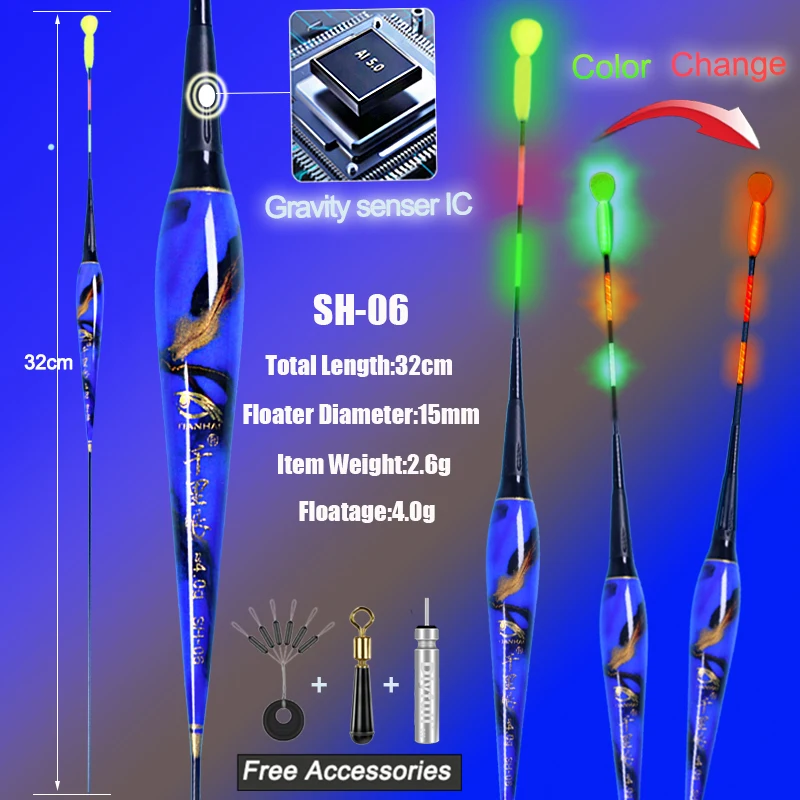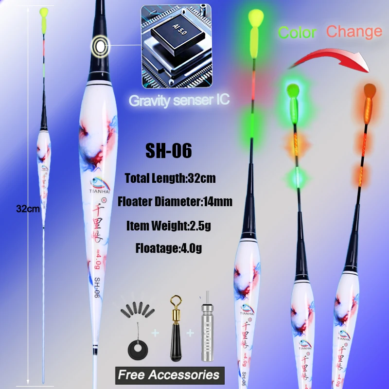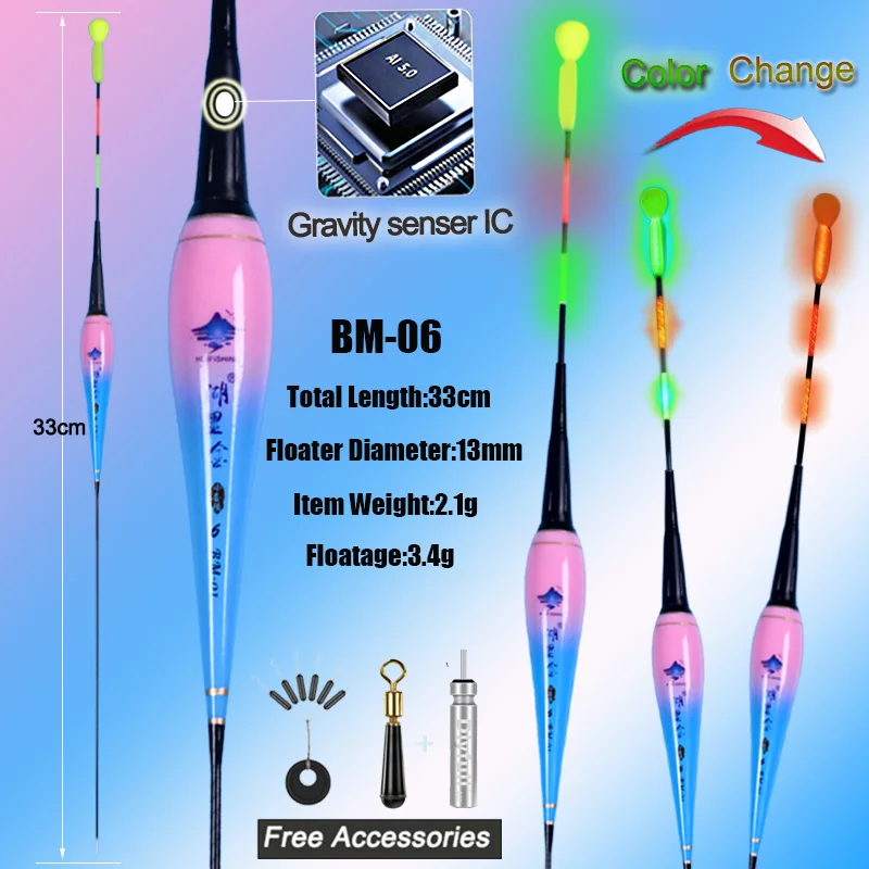 * Nuevo diseño, flotadores de pesca inteligentes, función de sensor de gravedad.*Mejora de la fuente de luz para pescar durante mucho tiempo, durabilidad de la batería extendida en 3-5 horas, tiempo de inducción de los cebos de solo 0,01 s.*Cuando el pez muerde, el color de las luces cambia de verde a rojo.*Fibra óptica de alto brillo, buen rendimiento en transmisión de luz.*Trajes para diversos entornos de pesca.Especificaciones: