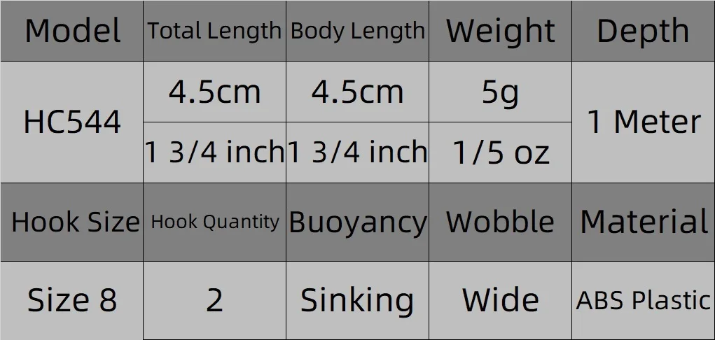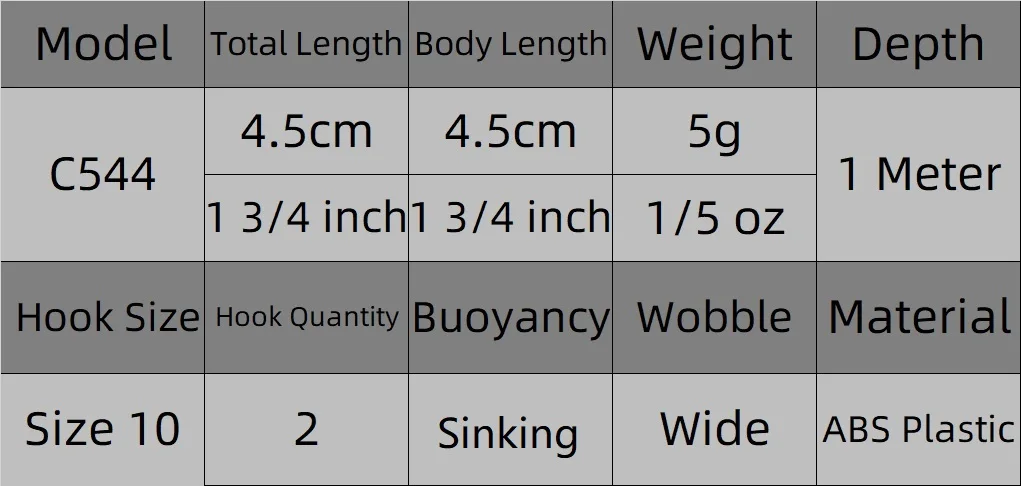Este señuelo de pesca mide 1 3/4 de pulgada (4,5 cm) de largo, pesa 1/5 oz (5,1 g) y tiene una profundidad de hundimiento.El tamaño del anzuelo recomendado para este señuelo es 10 y presenta una oscilación apretada cuando se recupera.