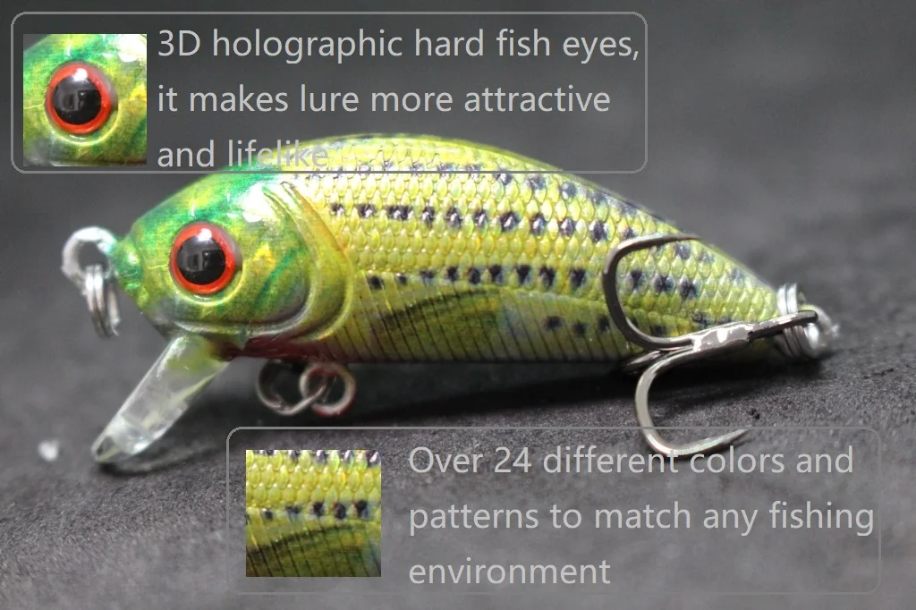 El señuelo ha sido probado en el tanque para garantizar su eficacia al atraer peces y está construido con material ABS de alta calidad.Los anzuelos triples curvados redondos de níquel negro proporcionan un excelente poder de enganche y el señuelo está acabado con un revestimiento epoxi para mayor durabilidad.