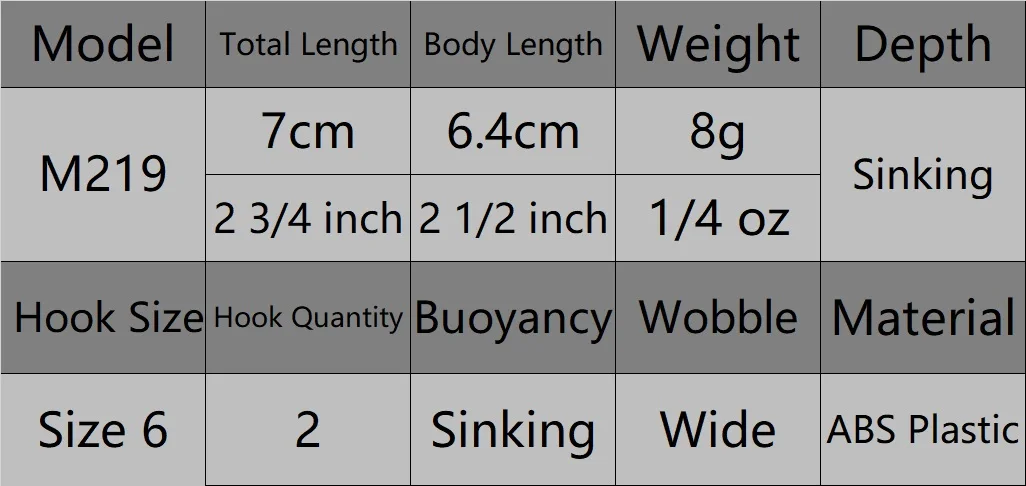 Este señuelo mide 7 cm de largo y tiene una longitud de cuerpo de 6,4 cm y pesa 7,1 g. Es un señuelo de buceo poco profundo con un anzuelo de tamaño 6.El señuelo está diseñado para tener una amplia oscilación y una acción de hundimiento lento, lo que lo convierte en una excelente opción para la pesca de jerkbait.Ha sido probado en tanque para garantizar el máximo rendimiento.